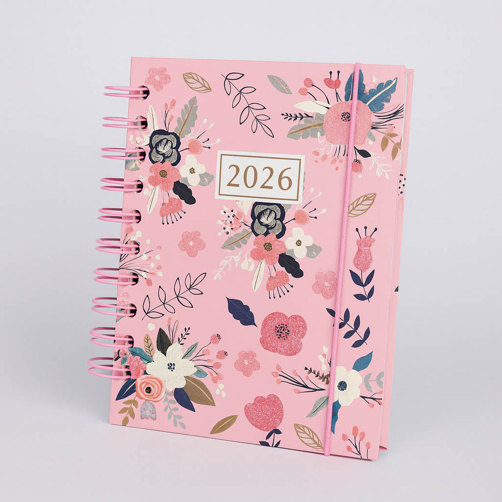 Acabamento: Capa dura com acabamento brilhante, fechamento com elástico e encadernação em espiral colorido