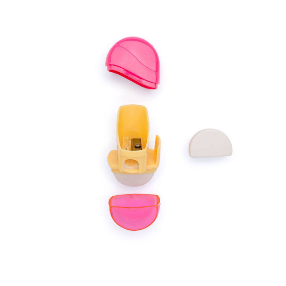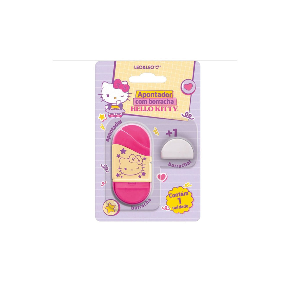 O kit contém um apontador compacto com depósito, decorado com a carinha da Hello Kitty e detalhes coloridos, além de uma borracha extra, ideal para correções rápidas e eficientes.