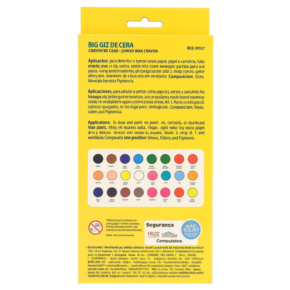 A embalagem contém 24 unidades de giz de cera jumbo colorido, com peso líquido total de 224g. As cores são variadas e incluem tons básicos e especiais. O Big Giz de Cera Acrilex é ideal para o dia a dia escolar e para projetos artísticos, oferecendo praticidade, qualidade e diversão em cada traço.