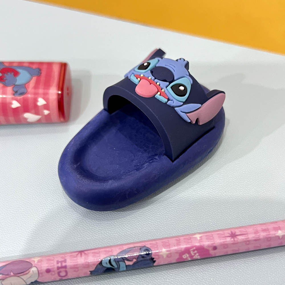 Feita em formato de chinelinho na cor azul, a borracha possui uma aplicação em relevo do rosto do Stitch, com suas orelhinhas e expressão divertida, tornando o produto não apenas funcional, mas também um item colecionável para fãs do personagem.