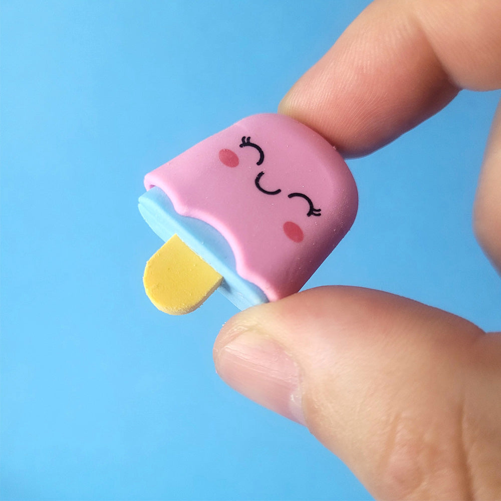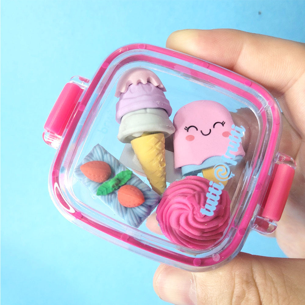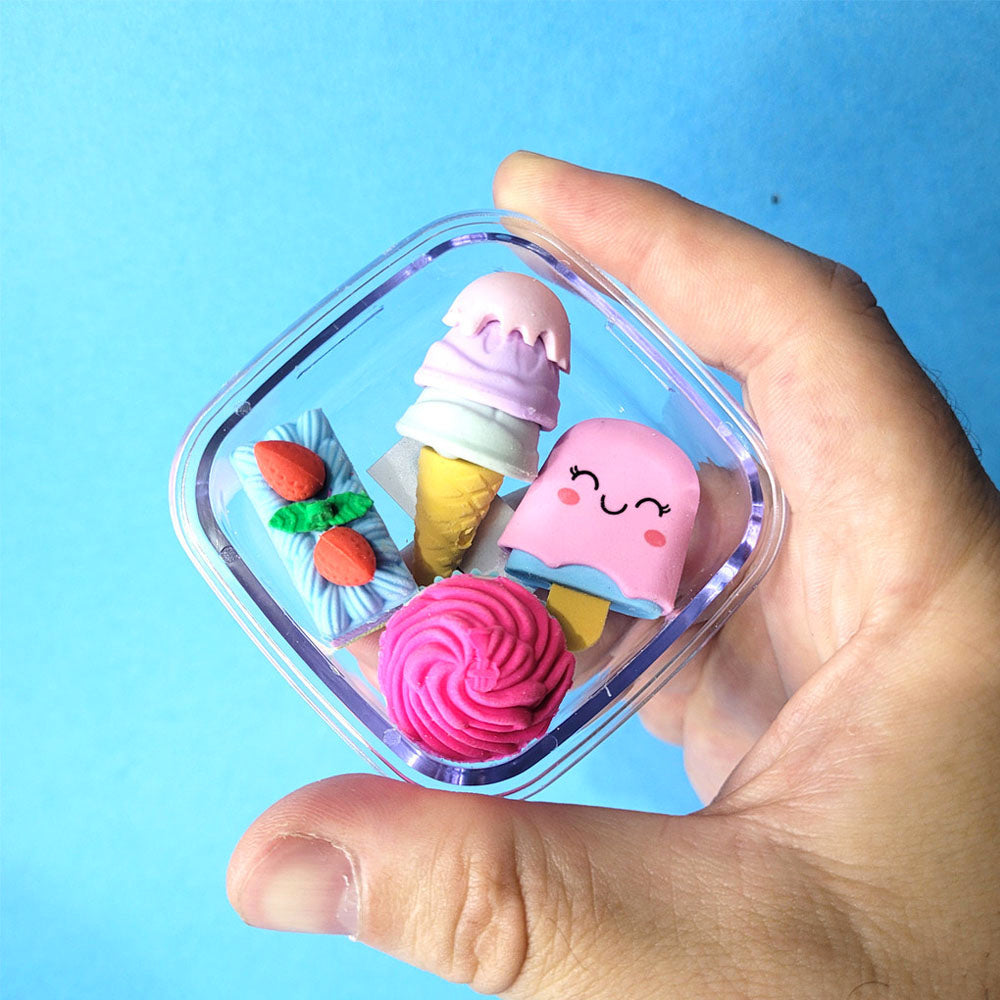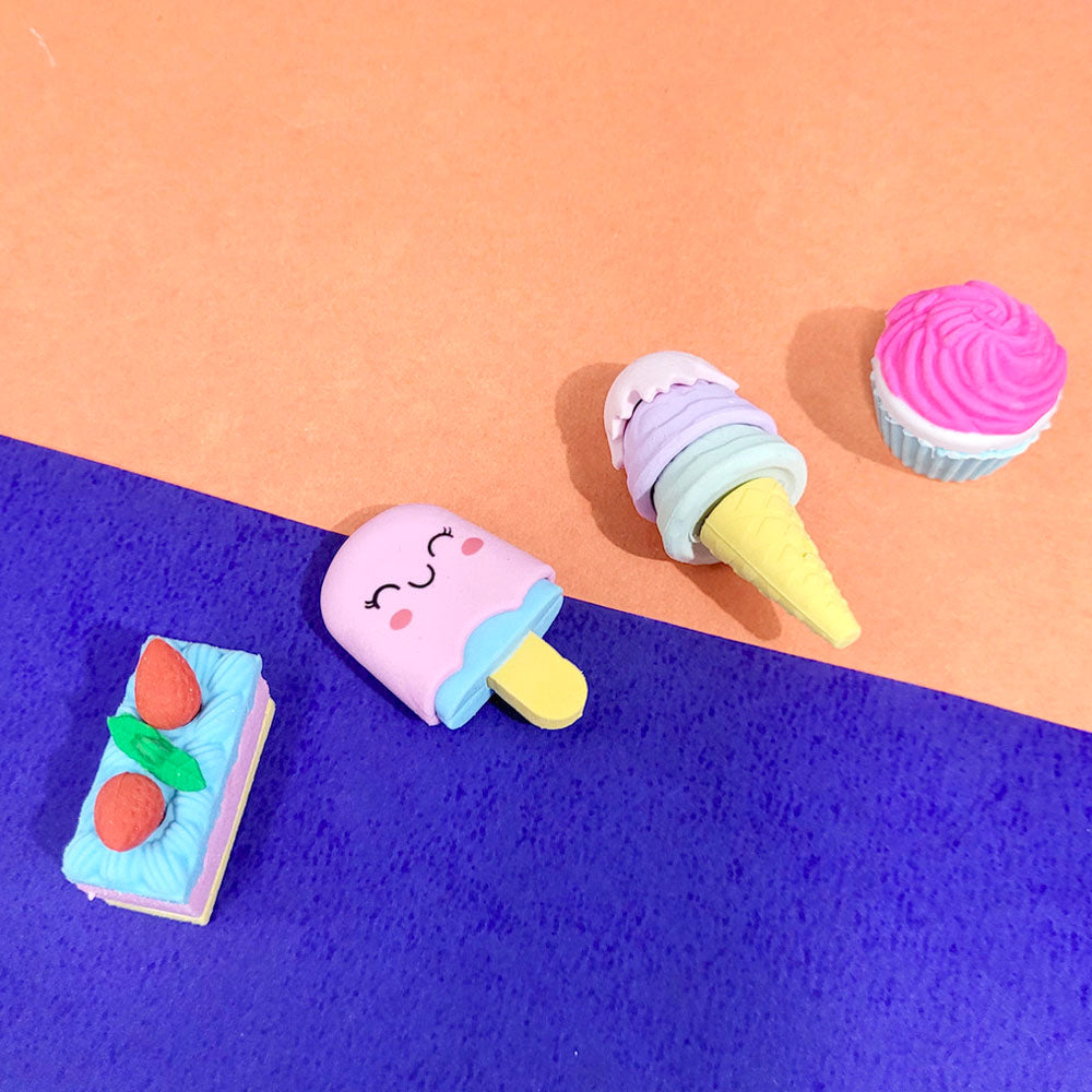 - Borrachas com formato de picolé, sorvete, bolo e cupcake, com partes removíveis para personalização (as peças encaixam umas nas outras).