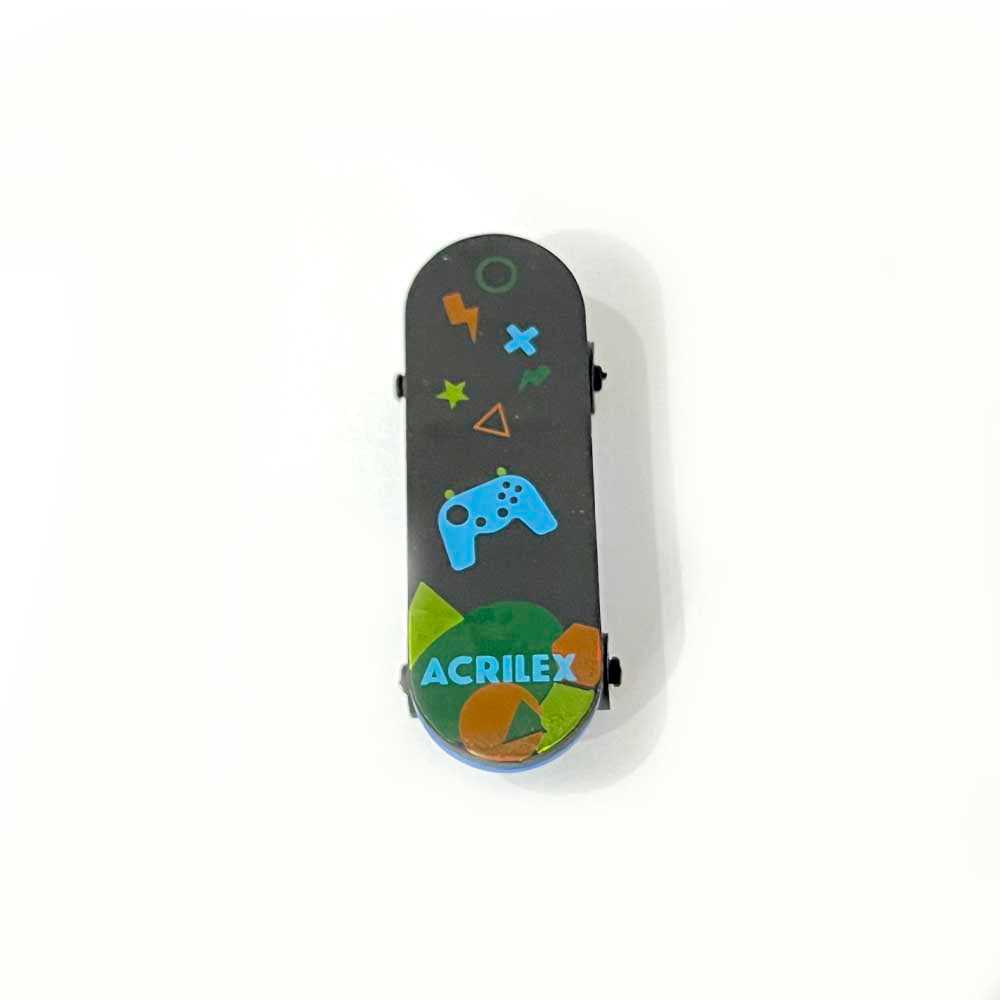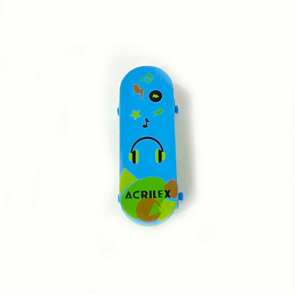 É pura diversão! Borracha escolar criativa, super fofa e divertida. Tem forma de skate e vem nas cores azul e verde, amarelo e rosa e preto e azul. A borracha possui uma textura super macia e eficiente para apagar. Não tóxica.