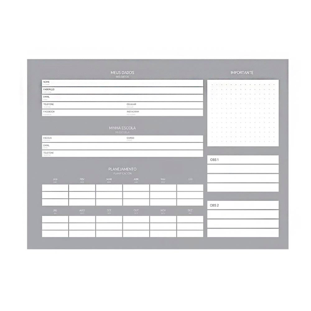 Ele possui capa dura, área para identificação, espiral e esta disponível em 2 estampas.