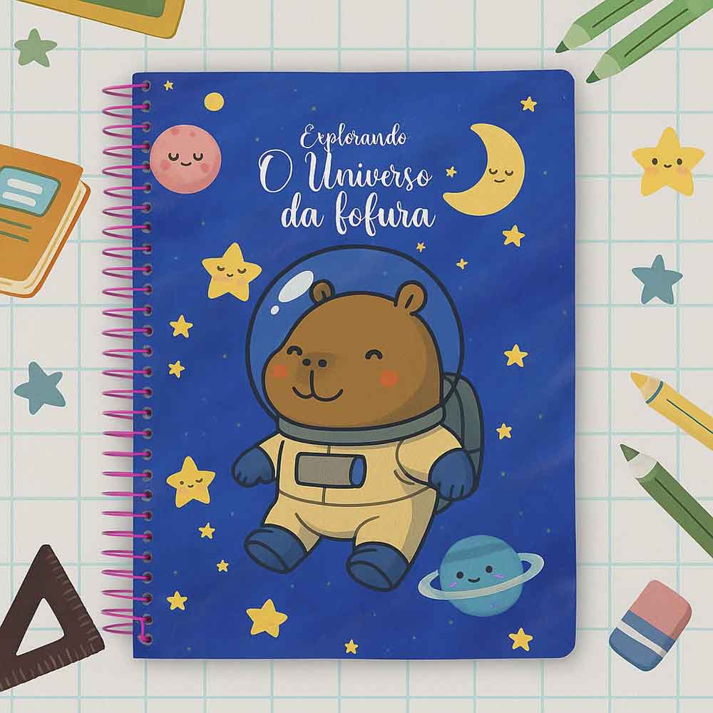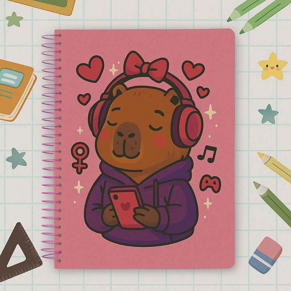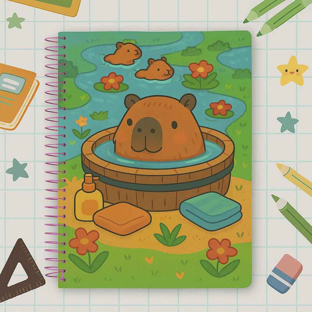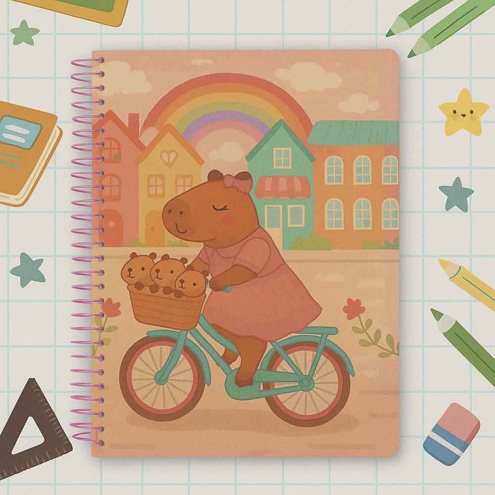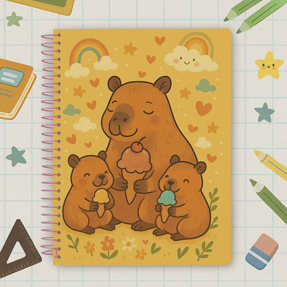 Um toque de fofura para a sua rotina! Este caderno universitário traz uma estampa irresistível com capivaras curtindo um momento divertido e colorido, ideal para quem ama papelaria criativa e cheia de personalidade. Perfeito para presentear ou dar mais charme às suas anotações do dia a dia. Uma explosão de fofura que vai conquistar seu coração!