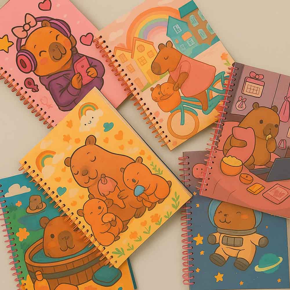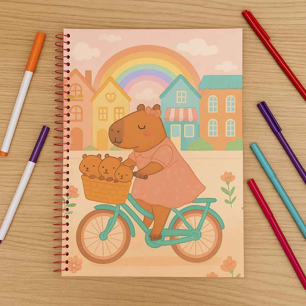 Um toque de fofura para a sua rotina! Este caderno universitário traz uma estampa irresistível com capivaras curtindo um momento divertido e colorido, ideal para quem ama papelaria criativa e cheia de personalidade.