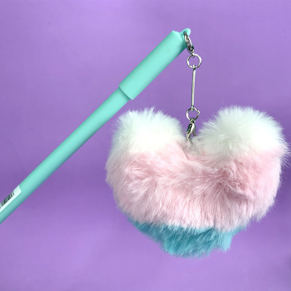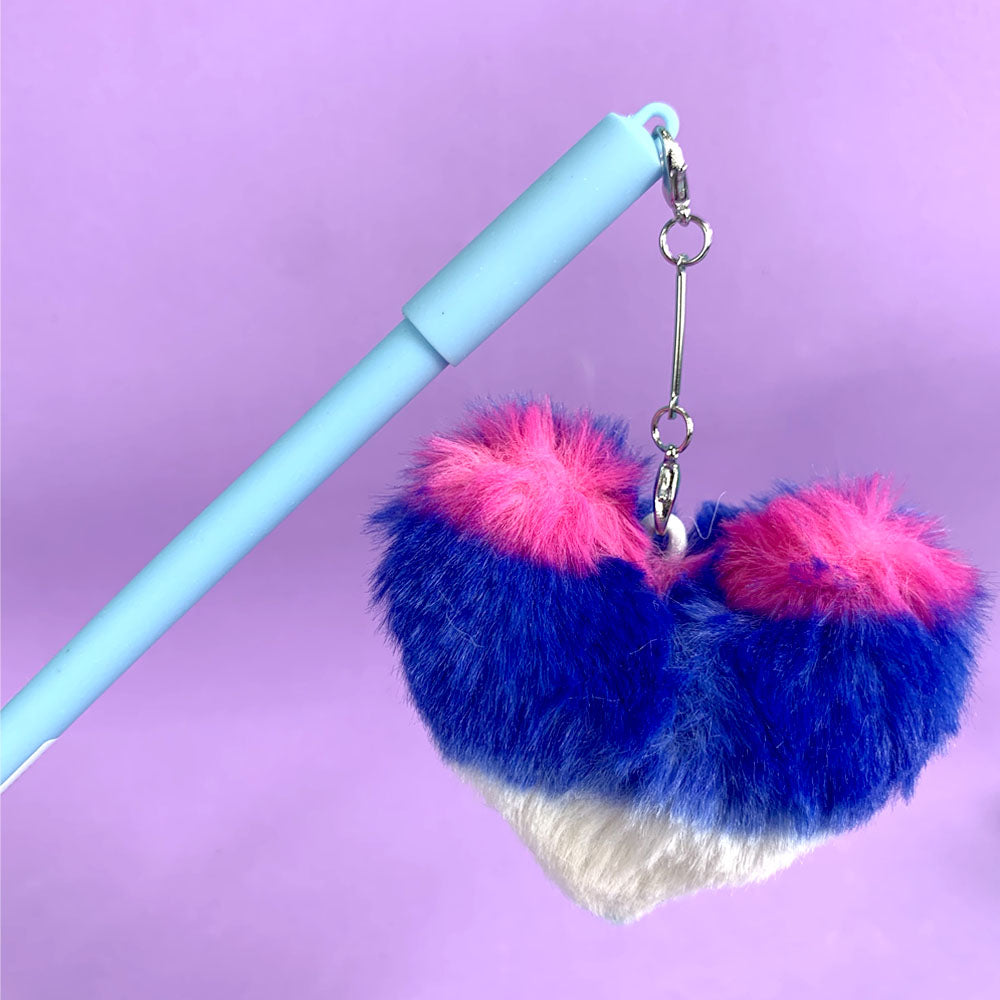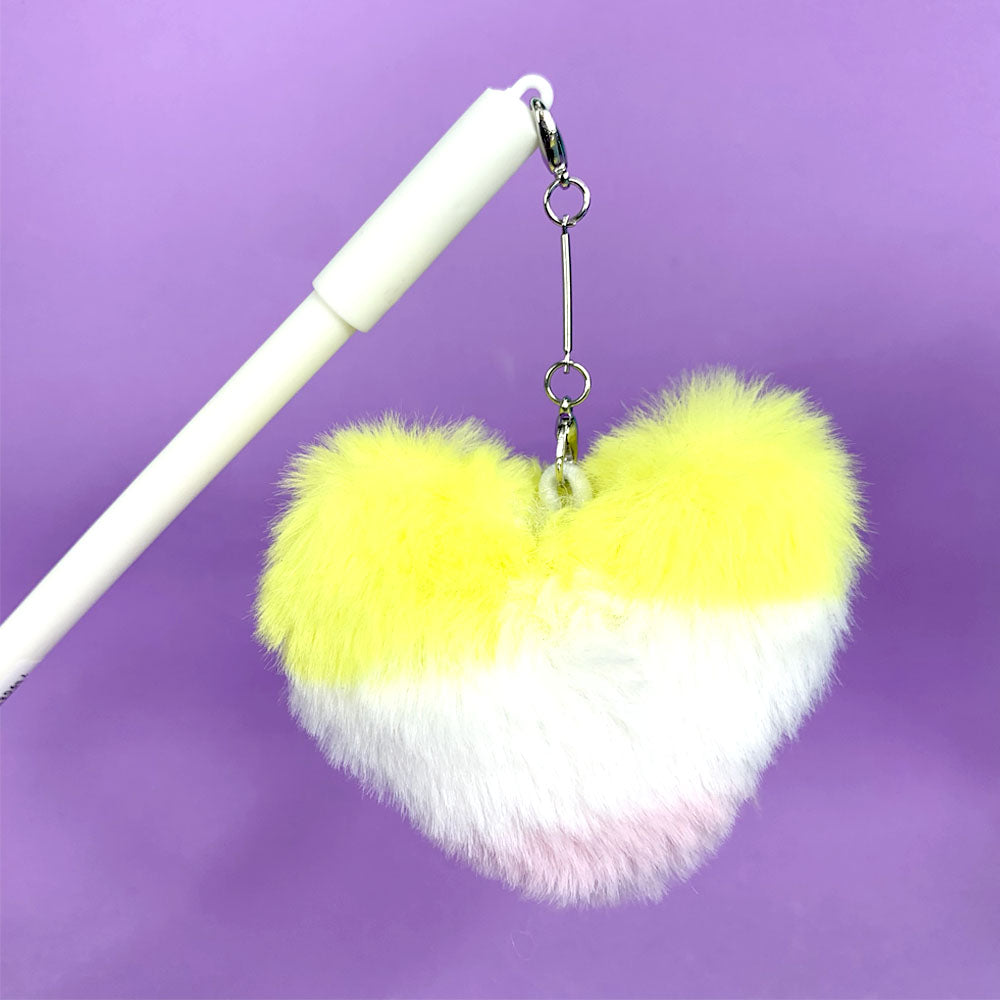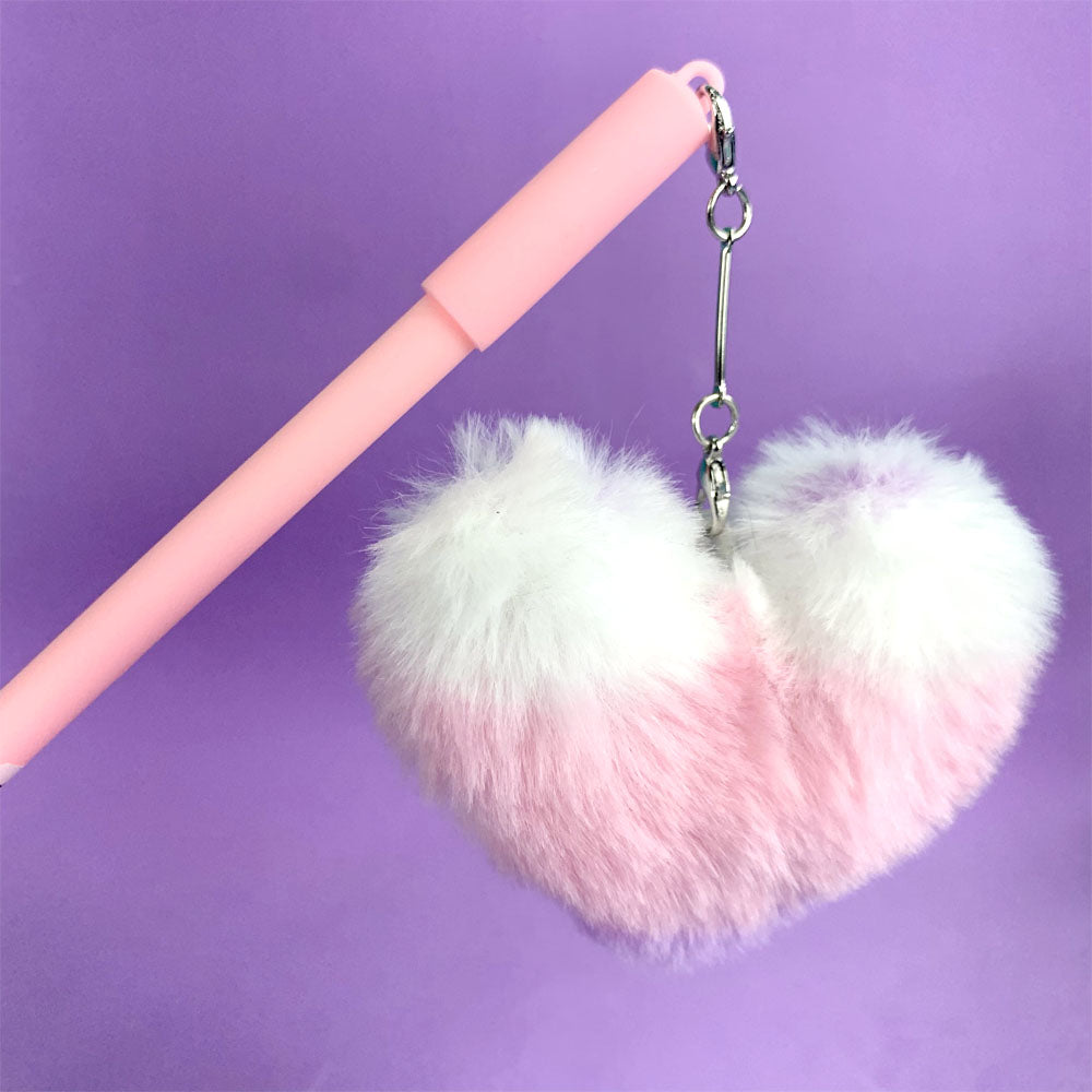 Caneta esferográfica com um lindo pompom de coração colorido pendurado na tampa da caneta.