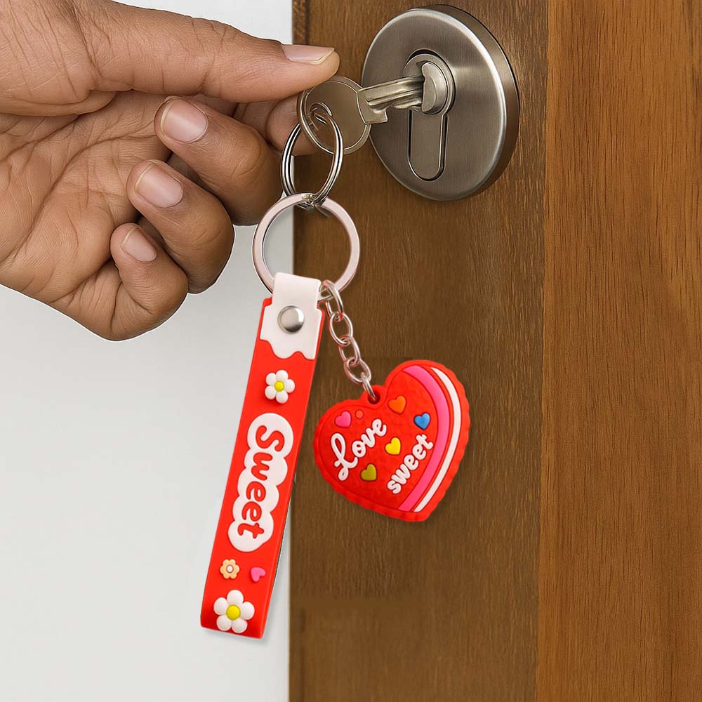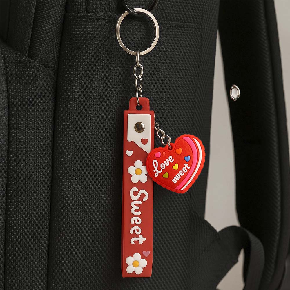 Surpreenda quem você ama com esse lindo chaveiro romântico! Com design exclusivo, ele conta com uma tira vermelha decorada com flores e corações, além de um charmoso pingente em formato de coração com as palavras "Love" e "Sweet" em relevo.