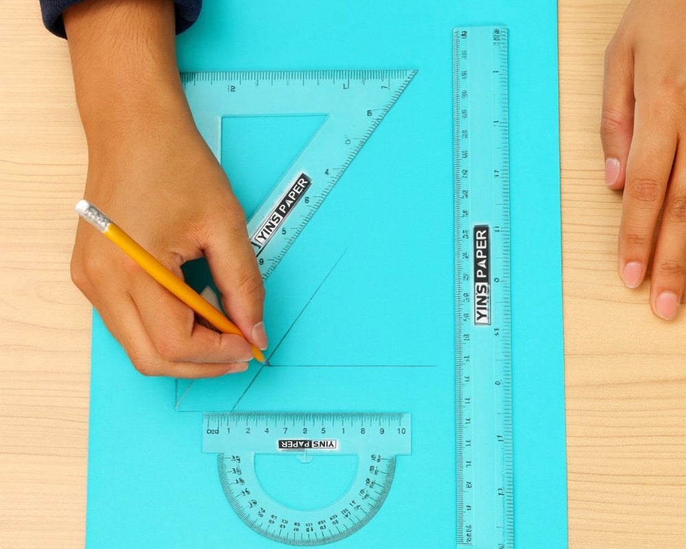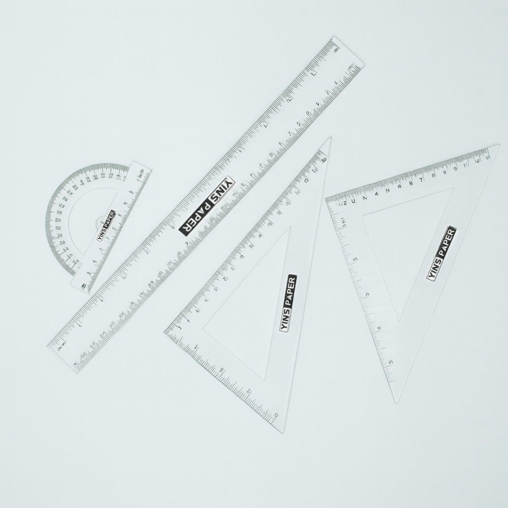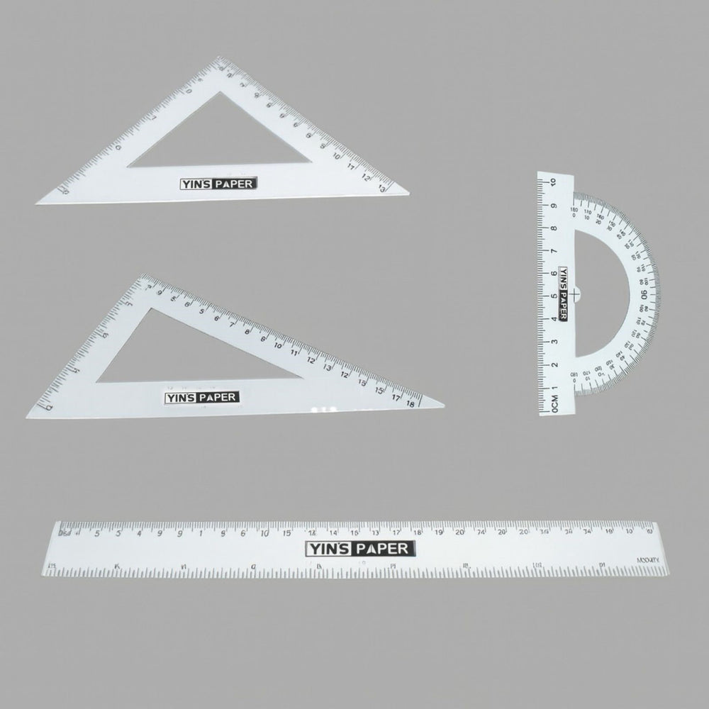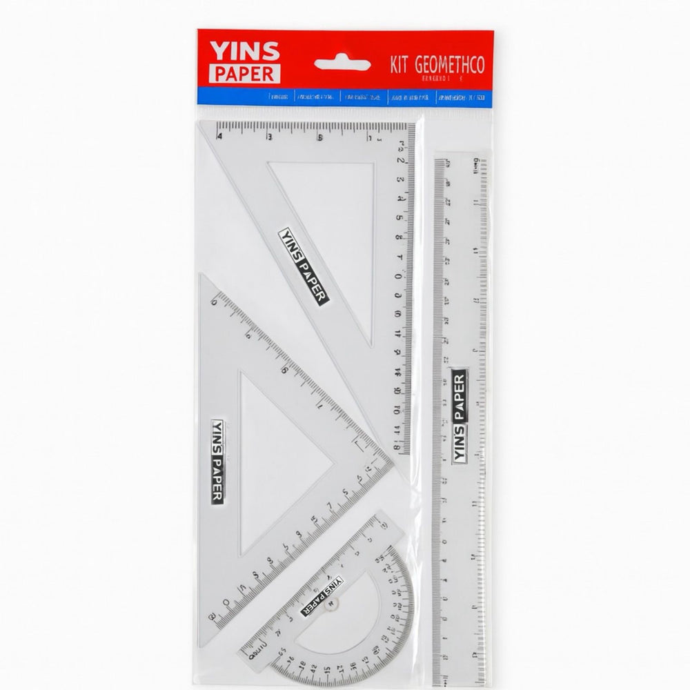 O Conjunto Geométrico 4 Peças: Régua 30cm, Esquadro 45°, Esquadro 60° e Transferidor 180° Yins Paper é ideal para estudantes, desenhistas e profissionais que precisam de precisão em medições e traçados geométricos.