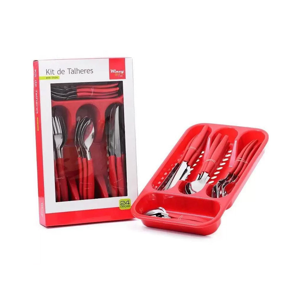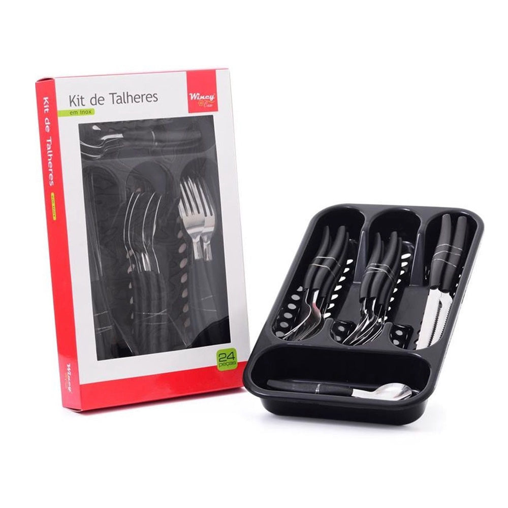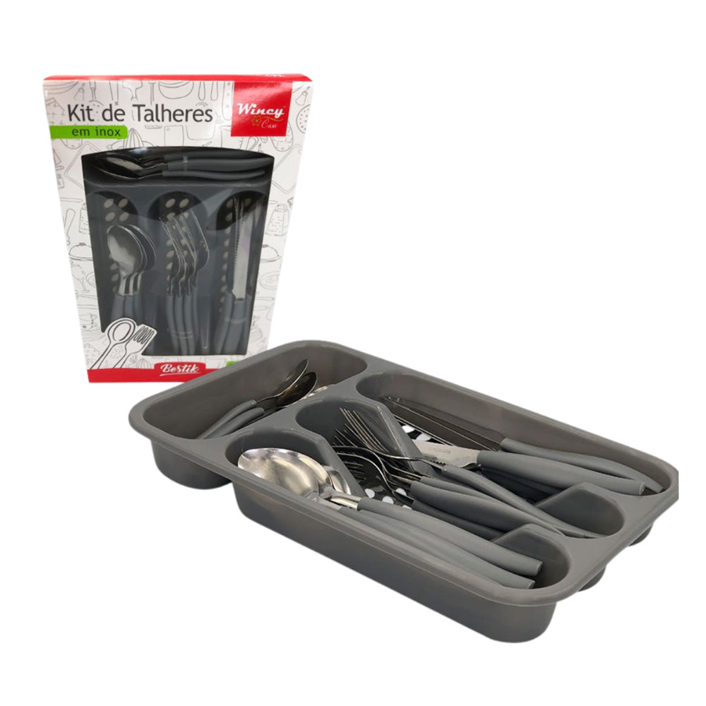 Contém: 6 facas + 6 gafos + 6 colheres + 6 colheres de chá + 1 gaveteiro 32,8cm x 19,8cm