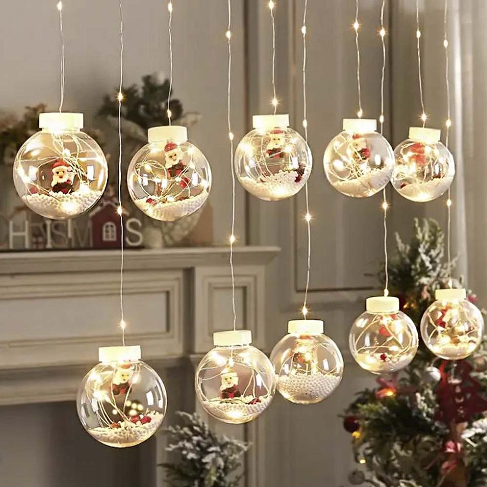Já o Modelo 2 possui personagens clássicos como Papai Noel, rena, boneco de neve, árvore de Natal e presentes, dentro de bolas transparentes decoradas. Essas esferas possuem flocos brancos que simulam neve.