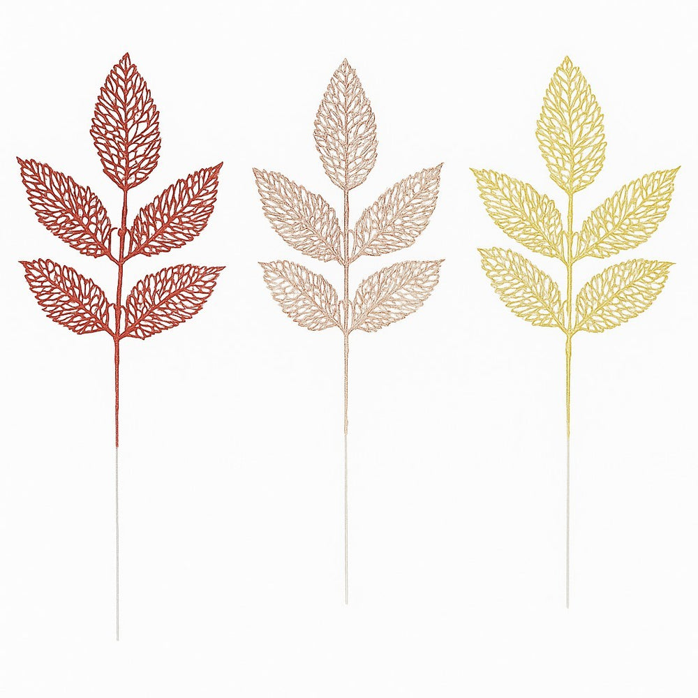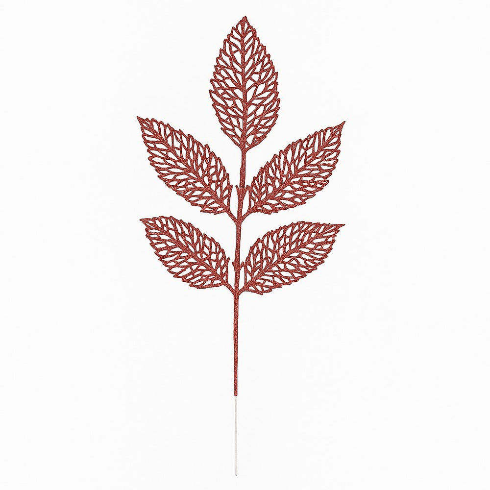 Este ramo decorativo possui folhas vazadas com acabamento em glitter, disponível nas cores dourado, champanhe e vermelho, perfeitas para compor uma decoração natalina elegante e cheia de encanto. Ideal para uso em árvores de Natal, guirlandas, arranjos florais, centros de mesa e embalagens de presente, adicionando um toque festivo e reluzente ao ambiente. Produto leve, flexível e de fácil aplicação.
