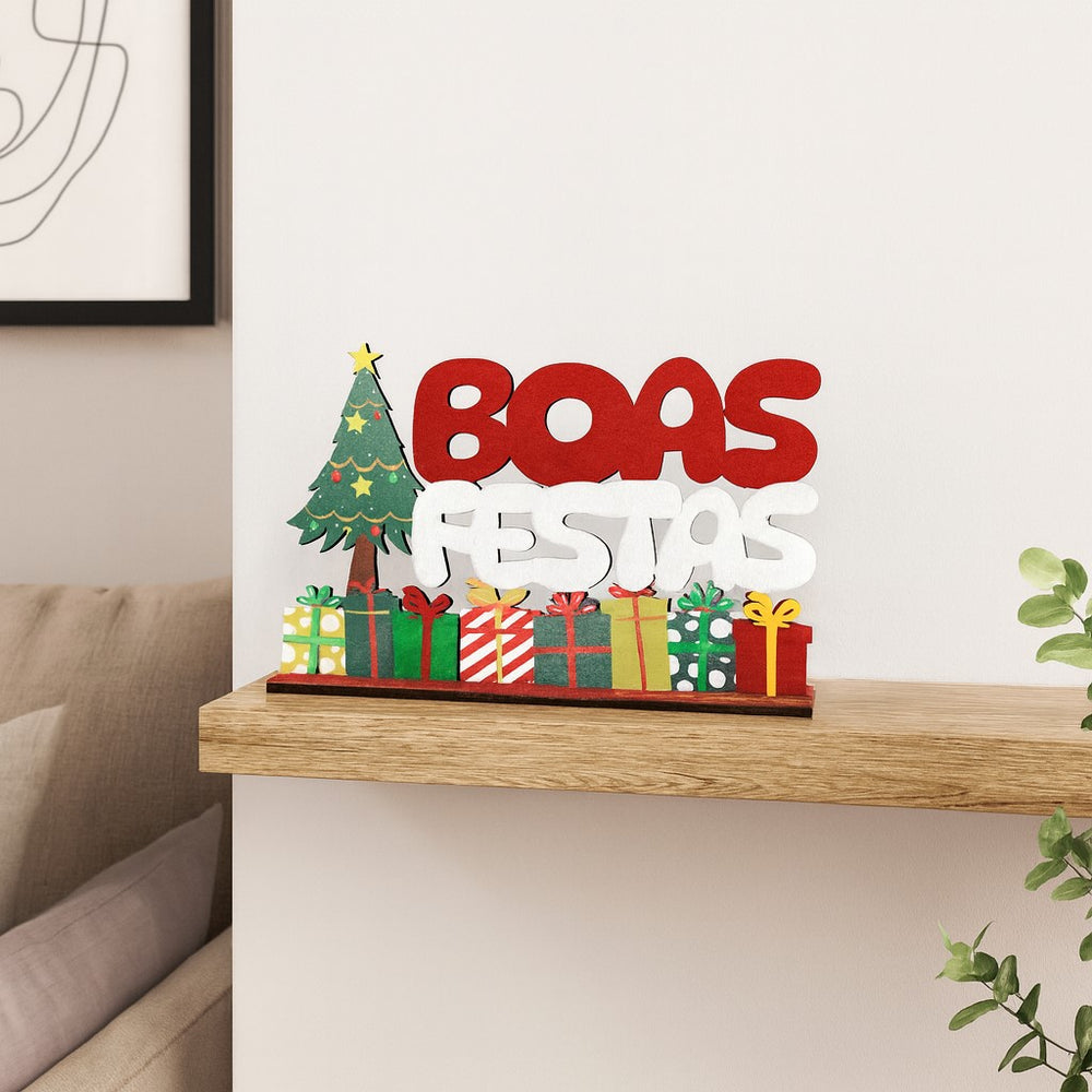 Produzido em material resistente e colorido, ele traz uma árvore de Natal decorada, presentes coloridos e a mensagem "Boas Festas" em destaque, combinando vermelho, branco e glitter para dar brilho especial à sua decoração. Perfeito para enfeitar mesas, prateleiras, balcões ou até complementar cestas e presentes natalinos.