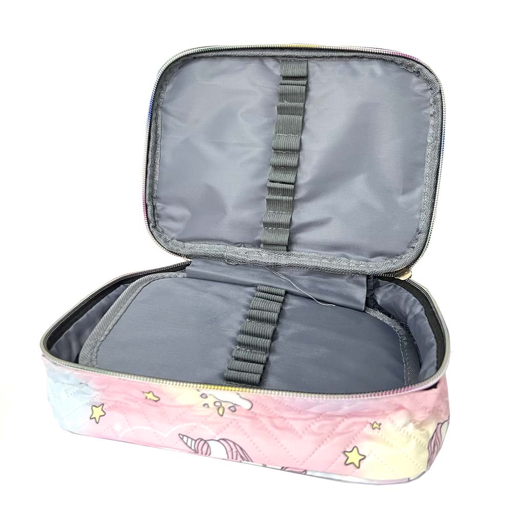 O Estojo Box Unicórnio Fwb, além de possuir uma linda estampa de unicórnio e cores divertidas, é ótimo para organizar seu material no dia a dia e possui material resistente com melhor durabilidade. Ele possui uma divisão com zíper, alça de mão, uma divisória central com 25 elásticos internos para você colocar lápis ou canetas para melhor organização e um amplo espaço interno para colocar os demais objetos.