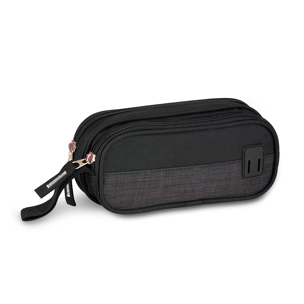 O estojo possui duas divisões com zíper (estojo duplo) . Ele é espaçoso e o material é de Poliéster. Tem bastante espaço e dá para guardar várias canetas, lápis e diversos acessórios. Ideal para guardar itens escolares, como por exemplo kit de canetas, lápis de cor, borracha, apontador, etc., ou mesmo objetos em geral, uma vez que possui duas divisões independentes e fechamento com zíper. Dá para fazer de necessaire também.
