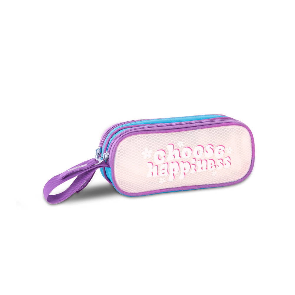 Estojo Duplo Escolar Choose Happiness é confeccionado em poliéster e com detalhe frontal telado transparência, e possuindo duas repartições.