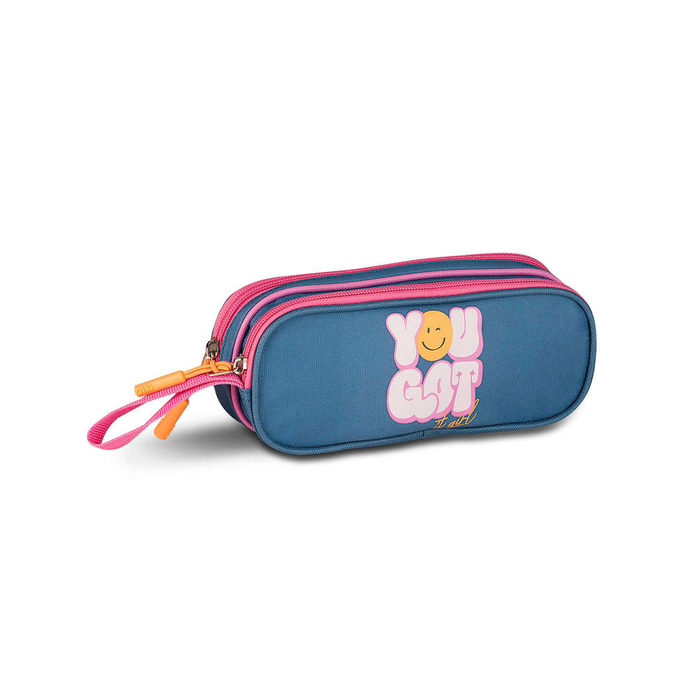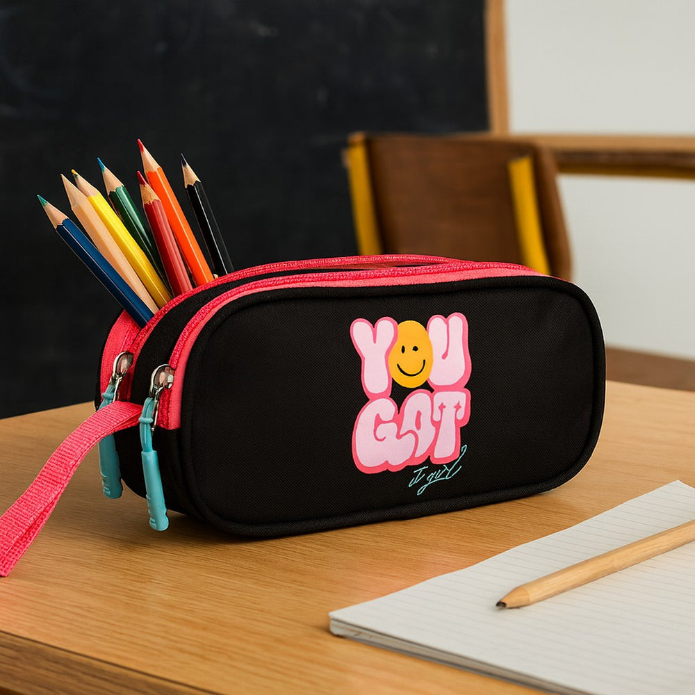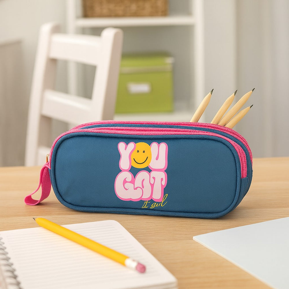 Deixe sua rotina mais prática e cheia de estilo com o estojo You Got It Girl. Com design moderno e divertido, ele traz uma estampa exclusiva com lettering colorido e carinha sorridente que transmite boas vibrações no dia a dia escolar. Possui dois amplos compartimentos com zíper e puxadores reforçados, perfeitos para organizar canetas, lápis, borrachas e demais acessórios, mantendo tudo sempre à mão. Confeccionado em material resistente e de fácil manutenção, garante maior durabilidade para acompanhar você por muito tempo. Disponível em diferentes combinações de cores vibrantes, como azul, preto e rosa, é a escolha ideal para quem busca praticidade sem abrir mão do charme e da alegria.