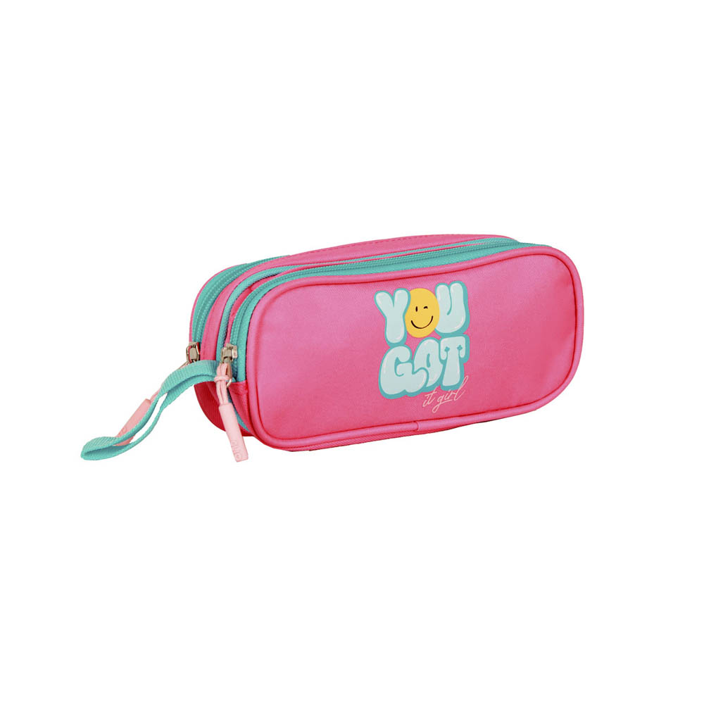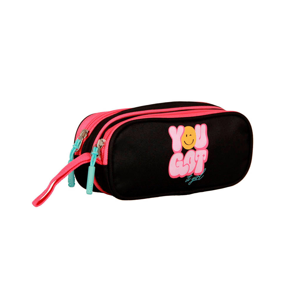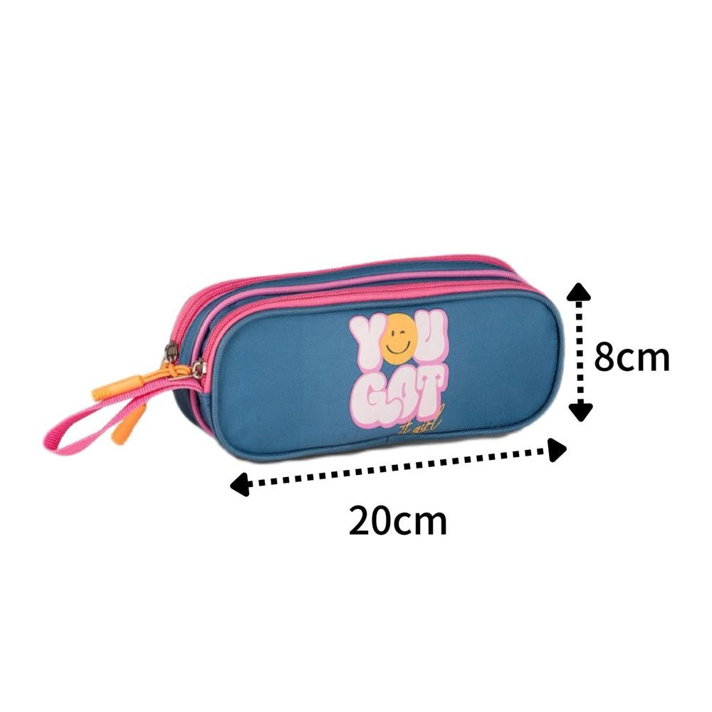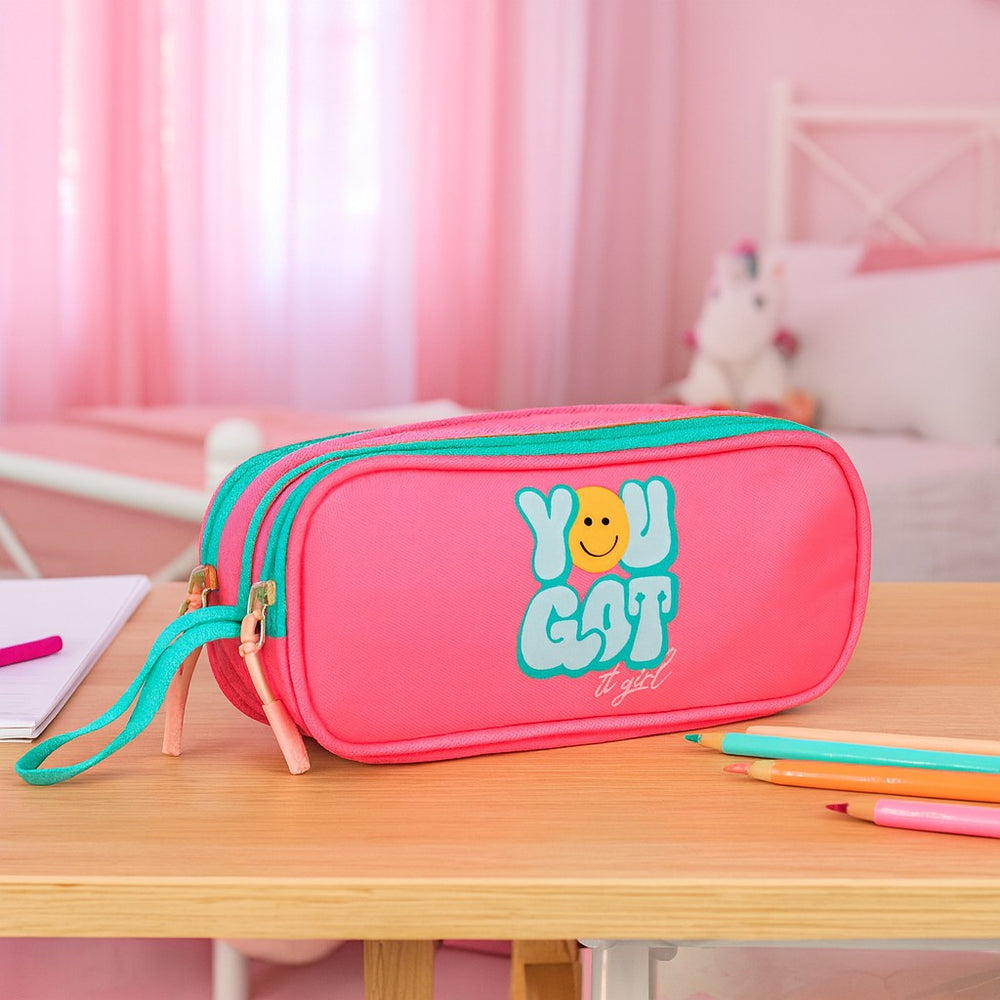 Deixe sua rotina mais prática e cheia de estilo com o estojo You Got It Girl. Com design moderno e divertido, ele traz uma estampa exclusiva com lettering colorido e carinha sorridente que transmite boas vibrações no dia a dia escolar. Possui dois amplos compartimentos com zíper e puxadores reforçados, perfeitos para organizar canetas, lápis, borrachas e demais acessórios, mantendo tudo sempre à mão. Confeccionado em material resistente e de fácil manutenção, garante maior durabilidade para acompanhar você por muito tempo. Disponível em diferentes combinações de cores vibrantes, como azul, preto e rosa, é a escolha ideal para quem busca praticidade sem abrir mão do charme e da alegria.