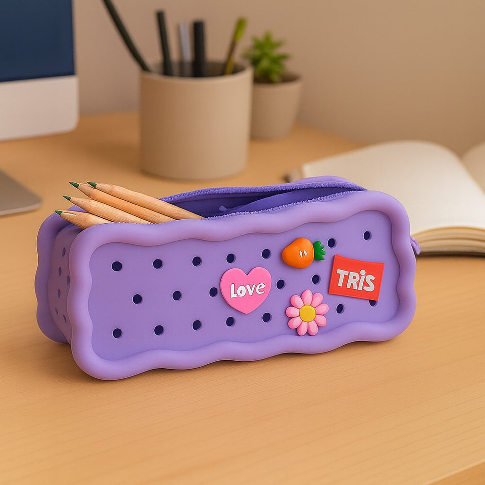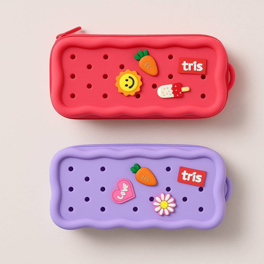 O modelo rosa vibrante acompanha quatro pins criativos: uma cenoura, um picolé colorido, uma florzinha sorridente e o logo TRIS. Já o modelo roxo delicado vem com uma cenoura, uma flor charmosa, um coração com a palavra “Love” e também o logo TRIS. Ambos apresentam design moderno com bordas onduladas, espaço interno amplo para guardar lápis, canetas e outros acessórios escolares, além da possibilidade de personalização com os pins colecionáveis. Uma opção divertida e estilosa para estudantes e amantes de papelaria que gostam de levar personalidade para a escola ou escritório.