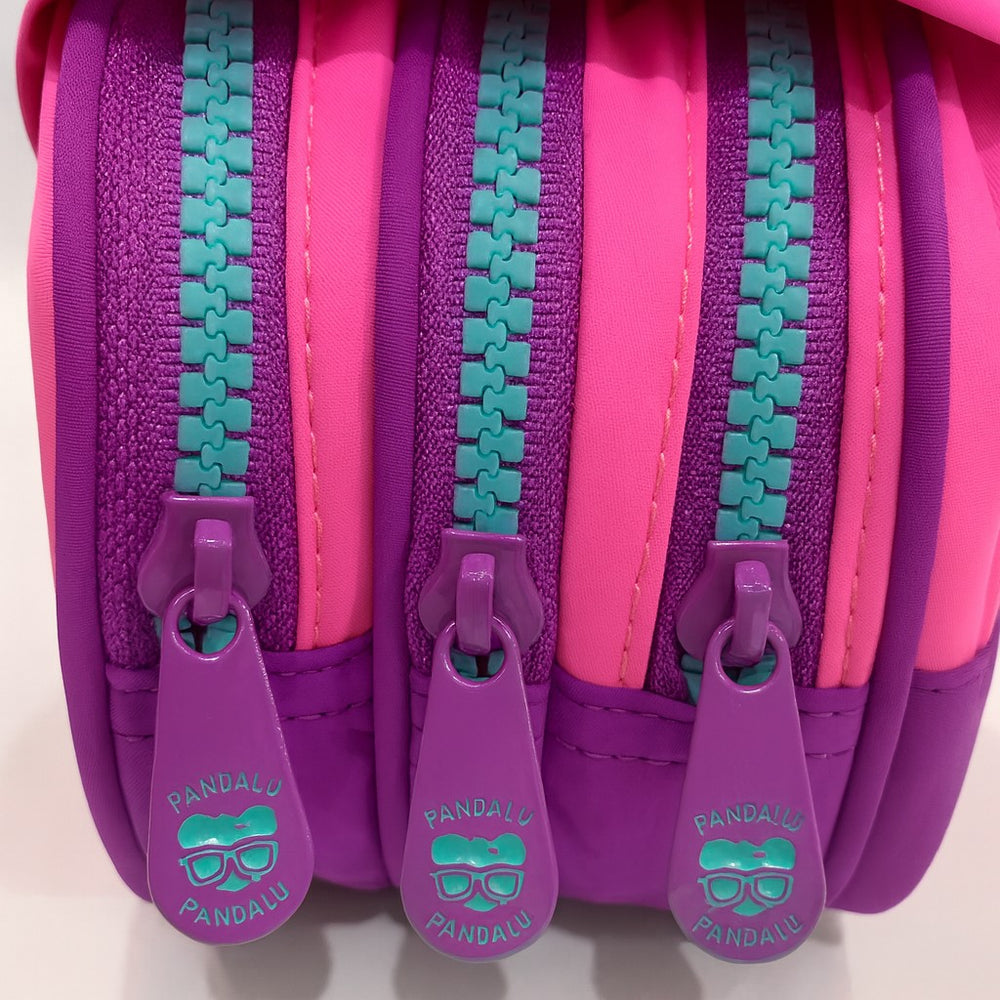 O modelo conta com três amplos compartimentos com zíper, perfeitos para separar lápis, canetas, borrachas e outros materiais de forma prática. Cada zíper possui puxadores personalizados com o logotipo Pandalu, em roxo e turquesa, garantindo um toque exclusivo e divertido ao produto.
