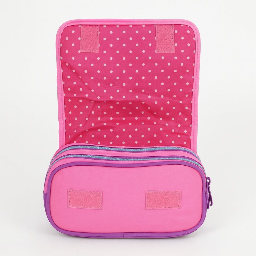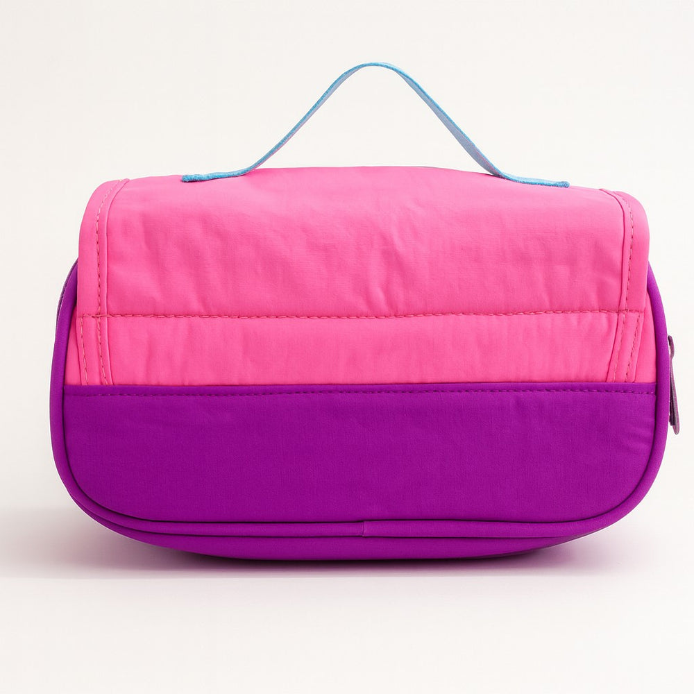Produzido em material resistente, ele combina as cores vibrantes rosa e roxo, com detalhes em azul-turquesa nos zíperes e acabamentos bem reforçados. Por dentro, o estojo apresenta um forro rosa com estampa de bolinhas brancas, que além de deixar o design mais delicado, facilita a limpeza e o uso diário.