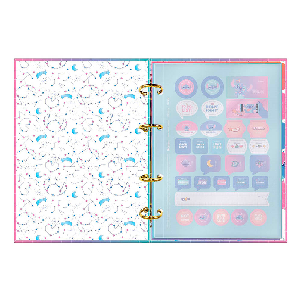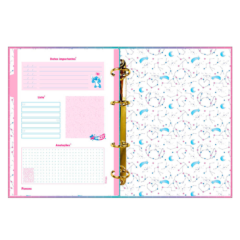 O fichário do nosso pequeno e amado Stitch é estiloso demais. Ele é o item perfeito para alegrar as atividades, ideal para estimular a organização dos estudos diários e alcançar as metas e objetivos sem perder a motivação. Cheio de versatilidade ao inserir ou retirar folhas, pois as argolas articuladas abrem, possibilitando esta ação. Útil e estiloso, foi feito para arrasar!