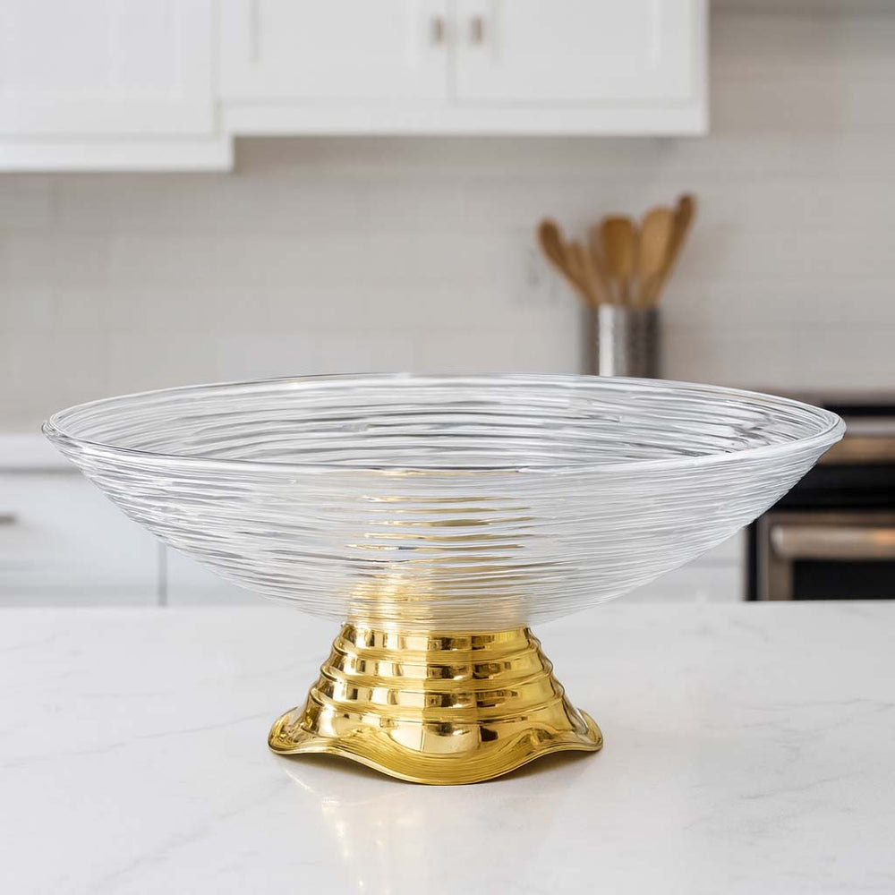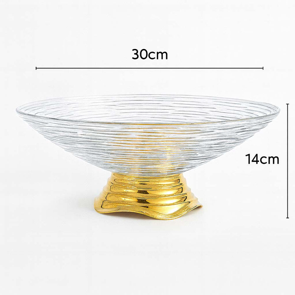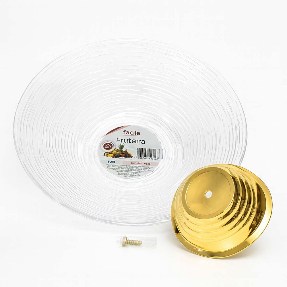 Fabricada em vidro de alta qualidade, sua estrutura transparente com detalhes em relevo cria um visual moderno e refinado, ideal para realçar as cores e formas das frutas. A base com acabamento dourado espelhado confere um toque de luxo, tornando-a perfeita tanto para o uso diário quanto para ocasiões especiais.