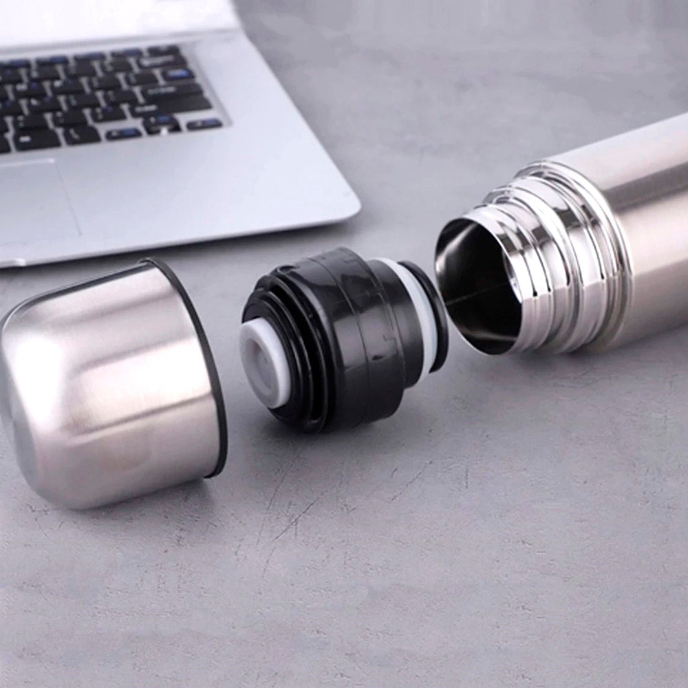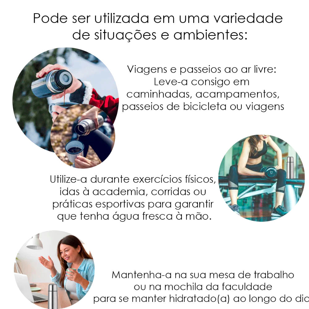 Com sua construção em aço inoxidável de alta qualidade, esta garrafa não só é durável, mas também mantém o calor por até 12 horas ou o frio por até 24 horas, proporcionando uma experiência de bebida perfeita, independentemente da temperatura ambiente.