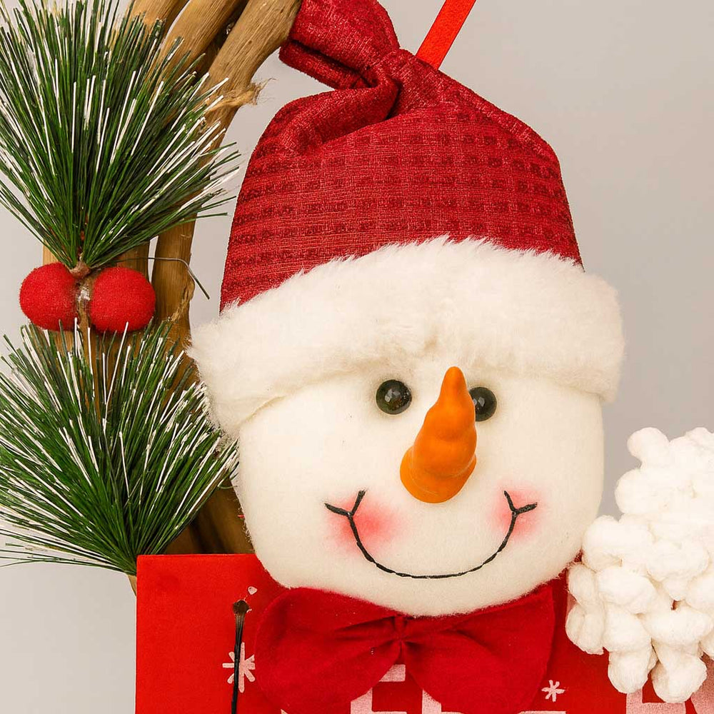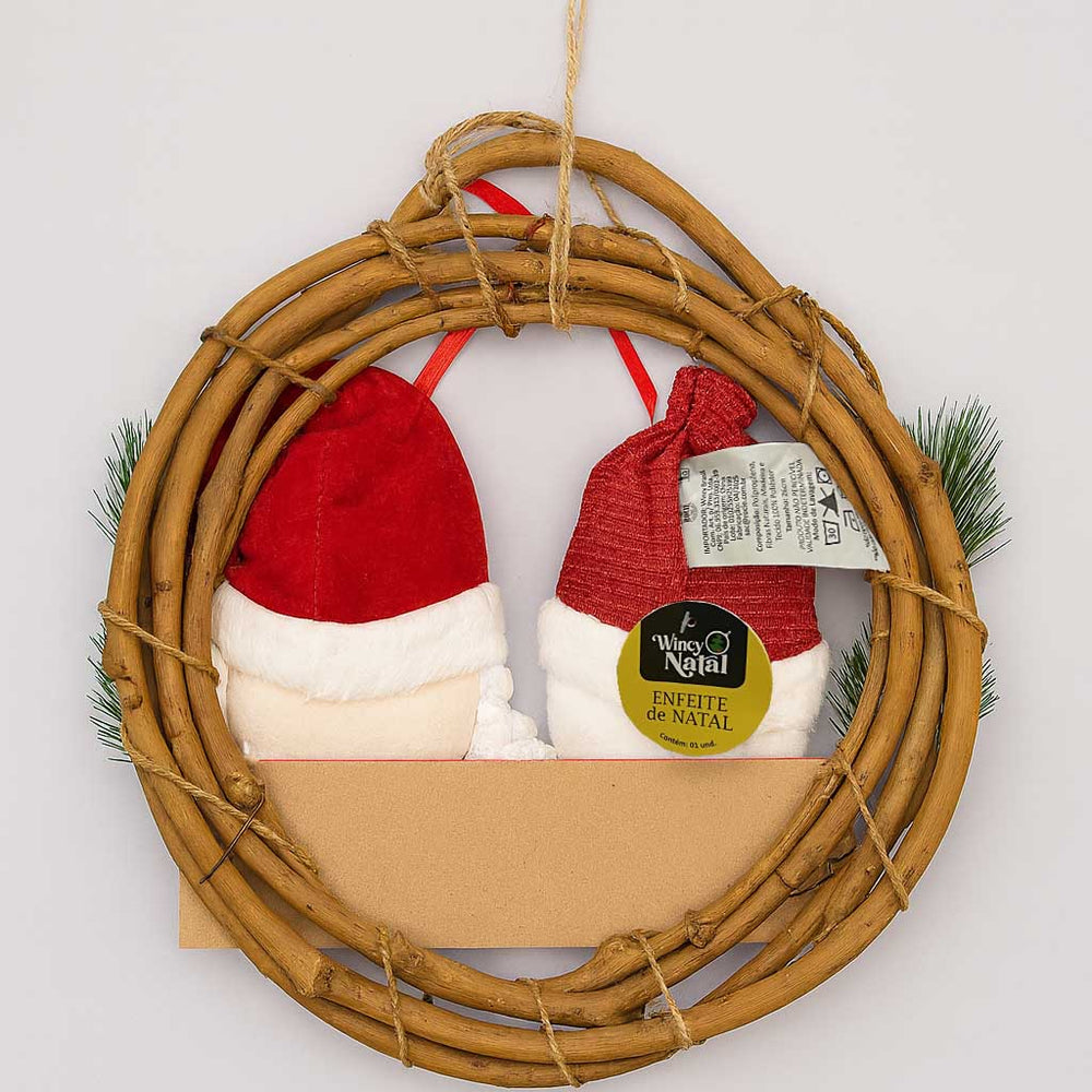 Encante sua decoração natalina com esta linda guirlanda rústica feita em base de galhos trançados e enfeitada com o carismático Papai Noel e um simpático Boneco de Neve.