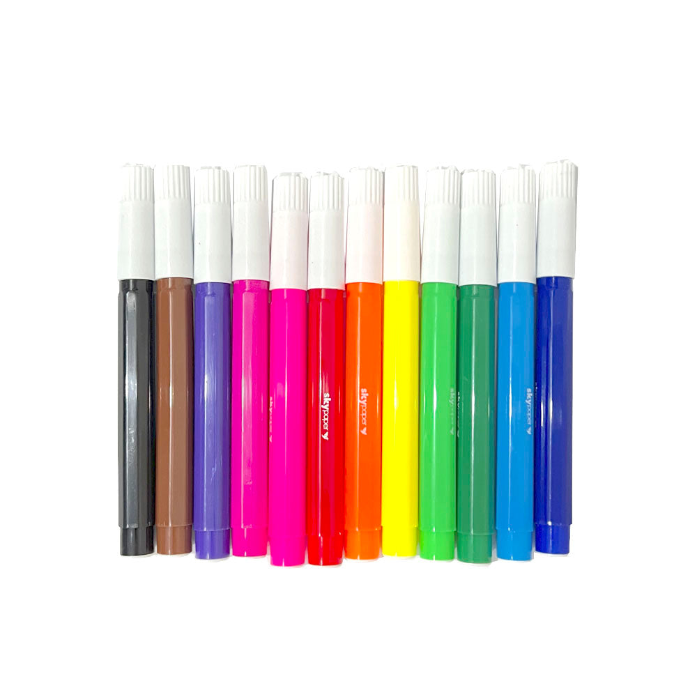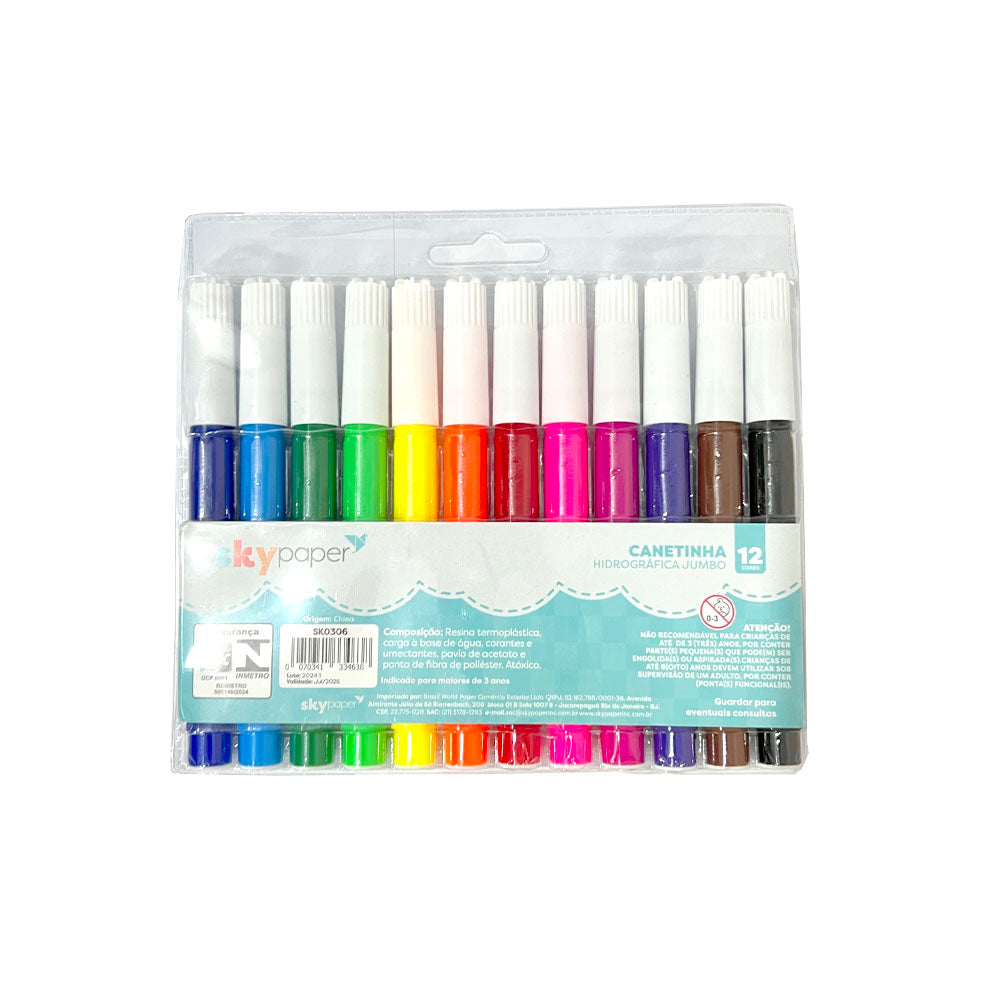 As canetinhas hidrográficas jumbo são grandes amigas da criançada. Com corpo robusto e ponta grossa, são ótimas aliadas no aprendizado da escrita e no desenvolvimento da coordenação motora. Sua tampa é anti-asfixiante e a tampinha da ponta de trás é muito bem fixada para evitar acidentes com os pequenos.