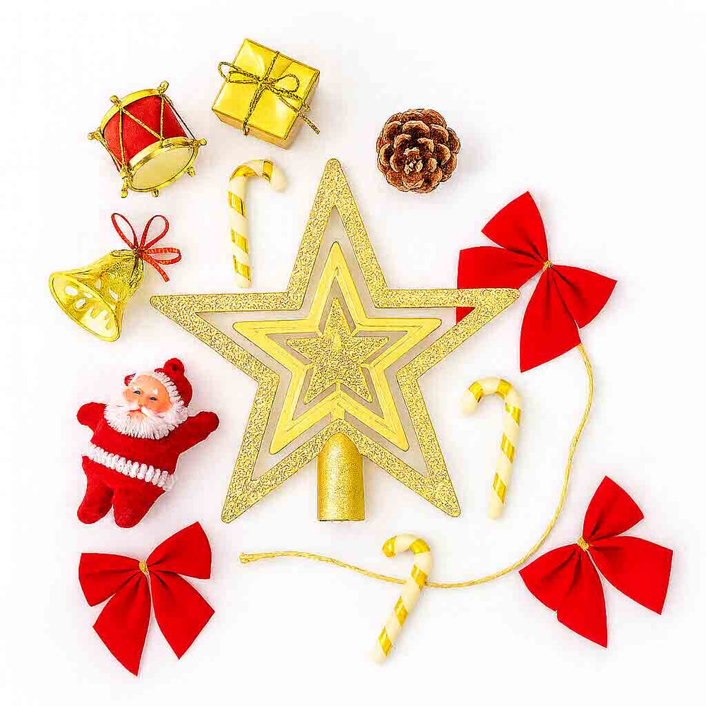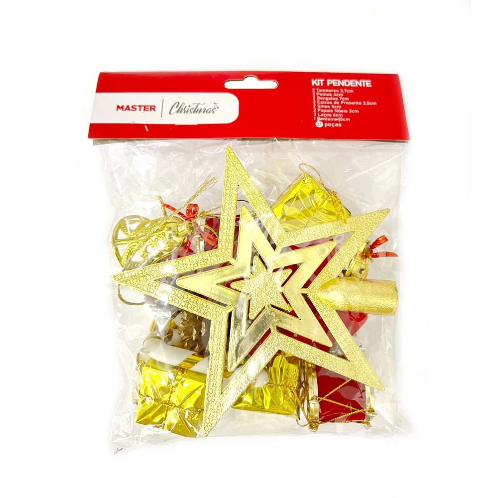 Contém: 2 tambores -> 3,7cm, 2 pinhas -> 4cm, 2 bengalas -> 7cm, 3 caixas de presente -> 3,5cm, 2 sinos -> 5cm, 2 papais nóeis -> 3cm, 3 laços-> 6cm e 1 ponteira -> 15cm
