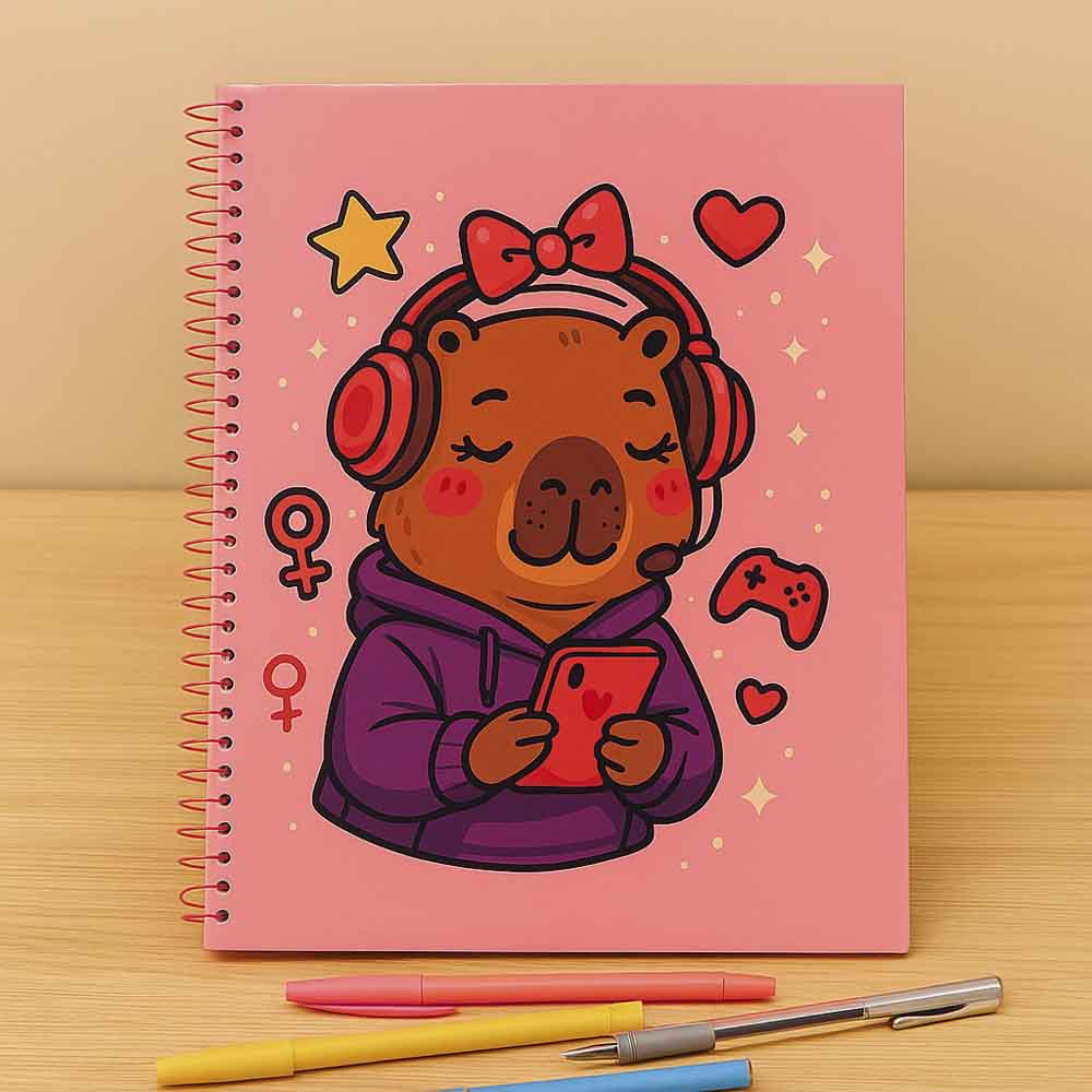 Capa dura com ilustrações adoráveis de capivaras em diferentes cenários (como passeios de bicicleta, momentos em família, aventuras espaciais e muito mais);