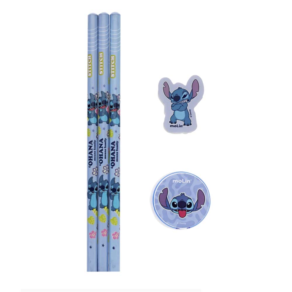 Todos os itens são decorados com o adorável alienígena azul Stitch, trazendo um toque divertido para as tarefas escolares.