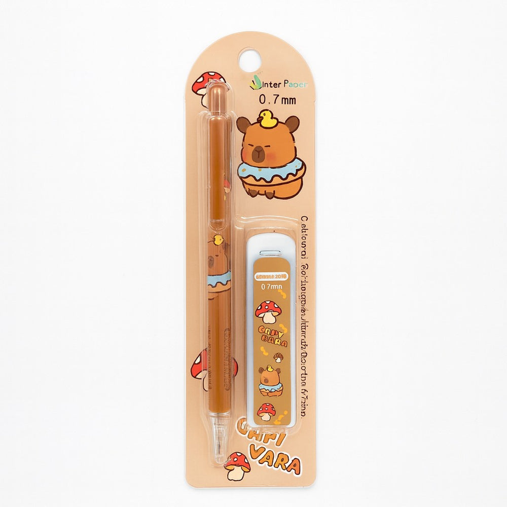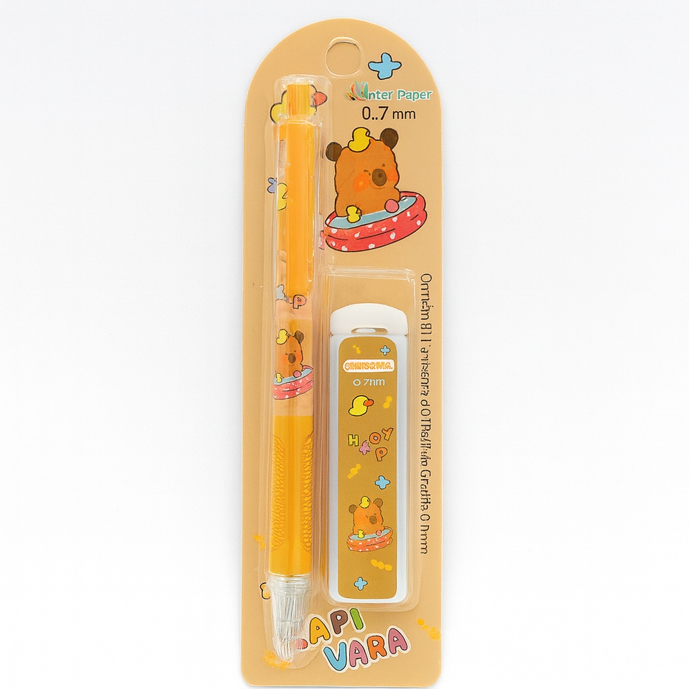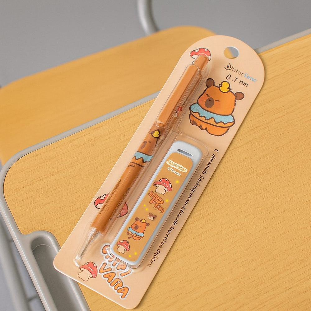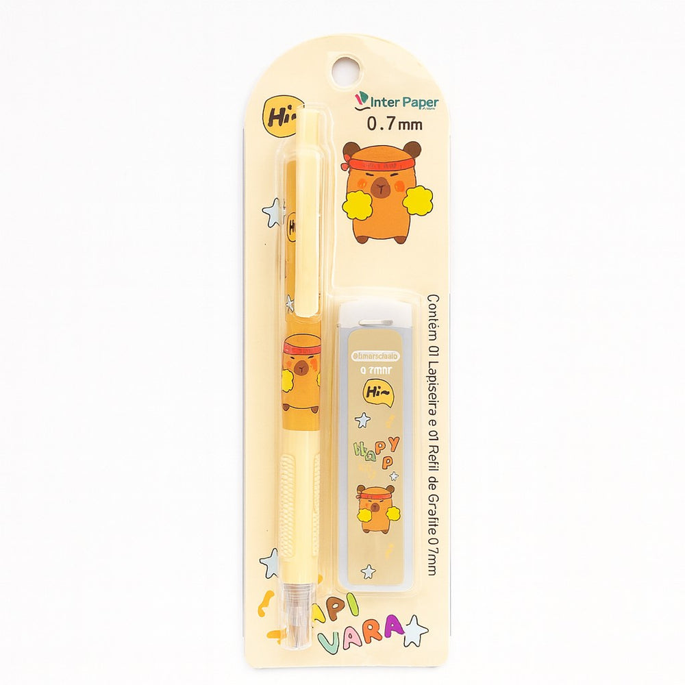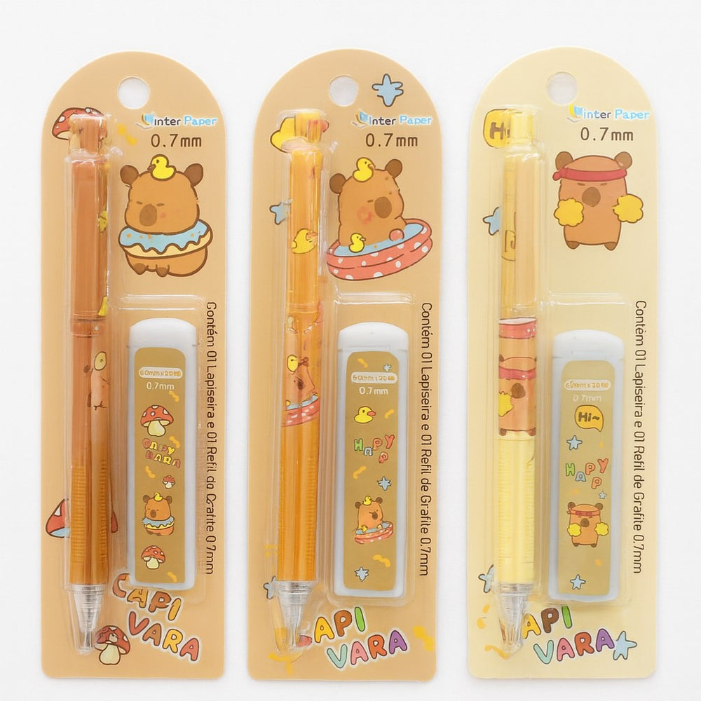 Cada kit acompanha 01 lapiseira e 01 tubo de grafite 0.7mm, sendo que as lapiseiras estão disponíveis nas cores amarelo, laranja e marrom, todas decoradas com ilustrações encantadoras de capivaras em situações divertidas.