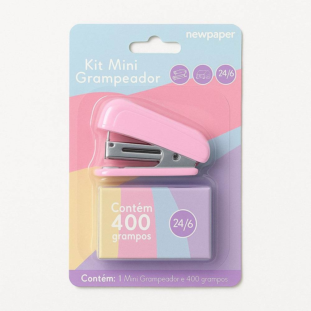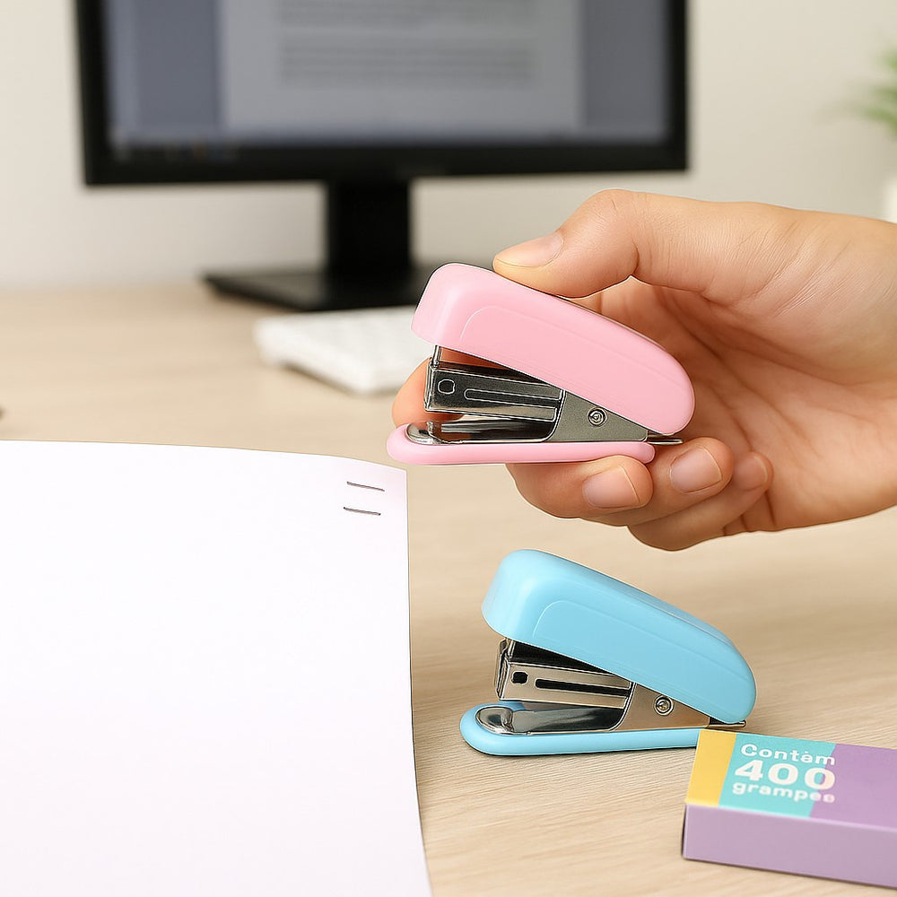 Contém: 1 Mini grampeador + 1 caixa com 400 grampos