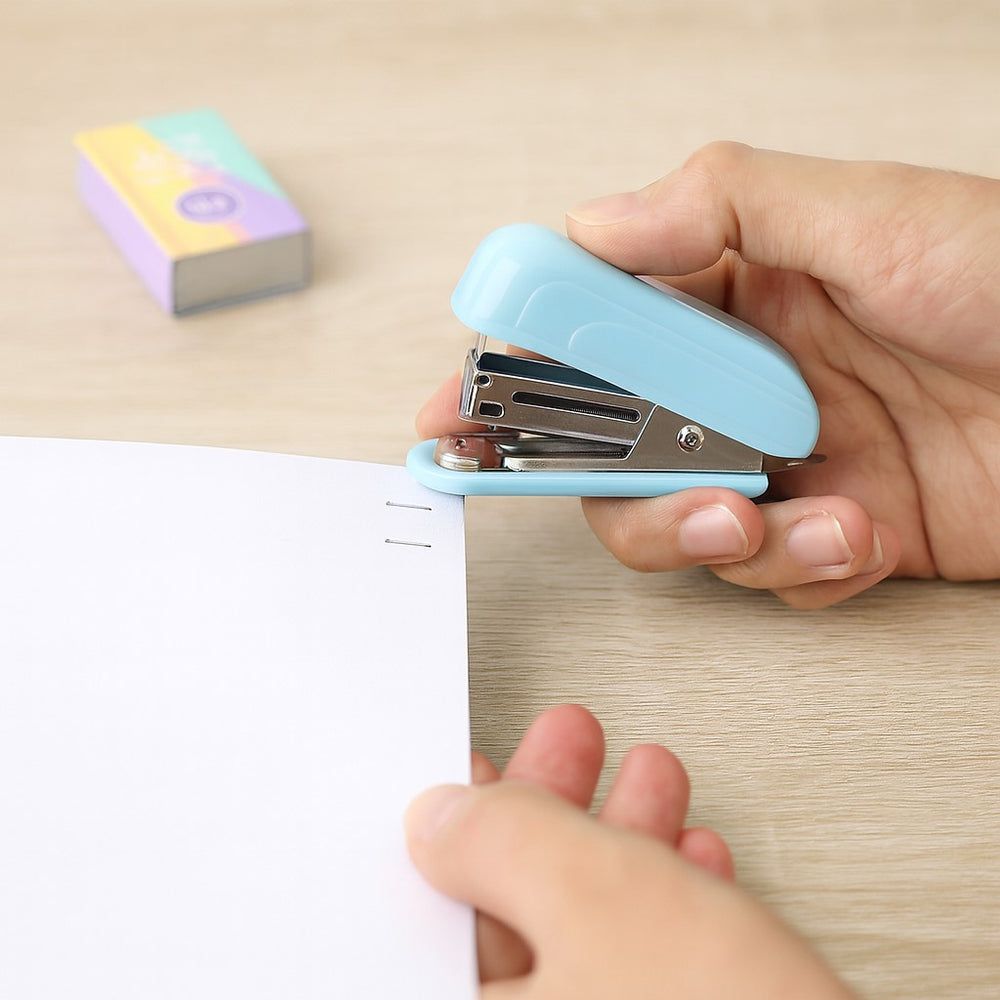 Mini grampeador com 400 grampos suporta grampear até 10 folhas com gramatura de 75g/m² ele é compacto, uma fofura para carregar em pequenos espaços como o estojo slim. A base e corpo é em plástico resistente, contendo estrutura em aço e mola com retração automática.