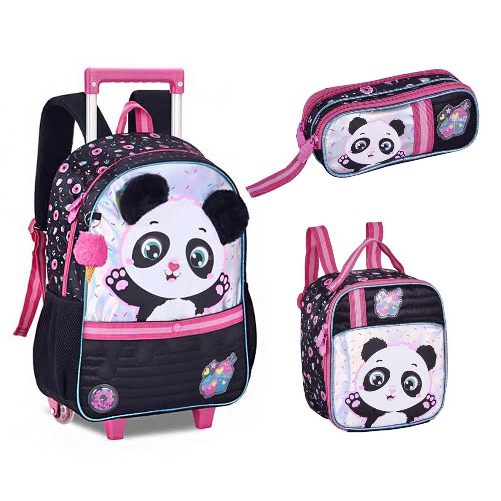 Super fofa, o Kit Mochila Escolar De Rodinha + Lancheira + Estojo Panda Clio possui um design encantador com estampa de panda com orelhas fofinhas e chaveiro sorvetinho, tornando-a ainda mais especial.
