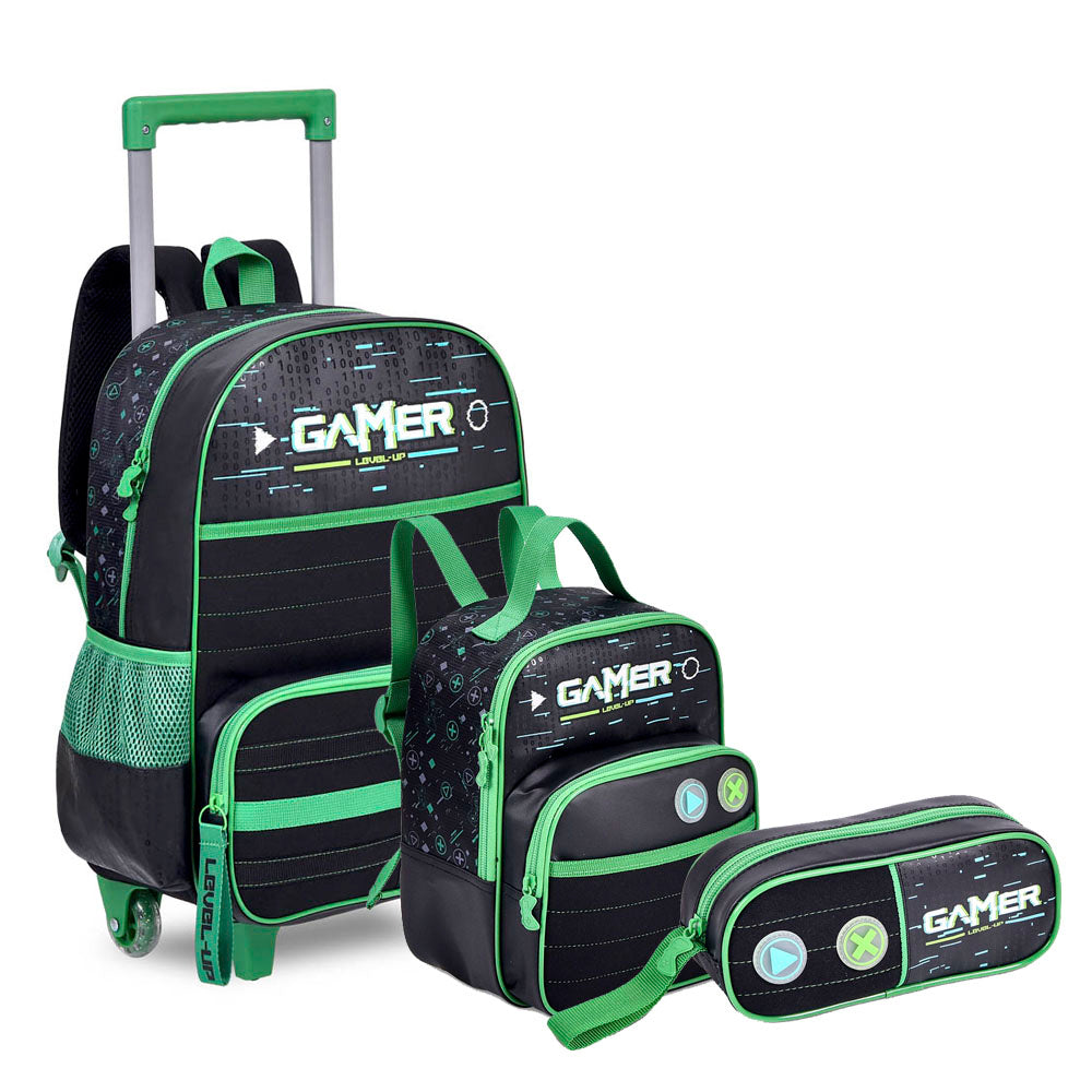 Viaja até ao mundo dos videogame com o novo Kit Mochila Roda Escolar Infantil Gamer Start Original Clio perfeita para organizar seu material escolar de forma simples e super pratica. Os meninos vão se amarrar com esse kit de mochila rodinha com lancheira e estojo.