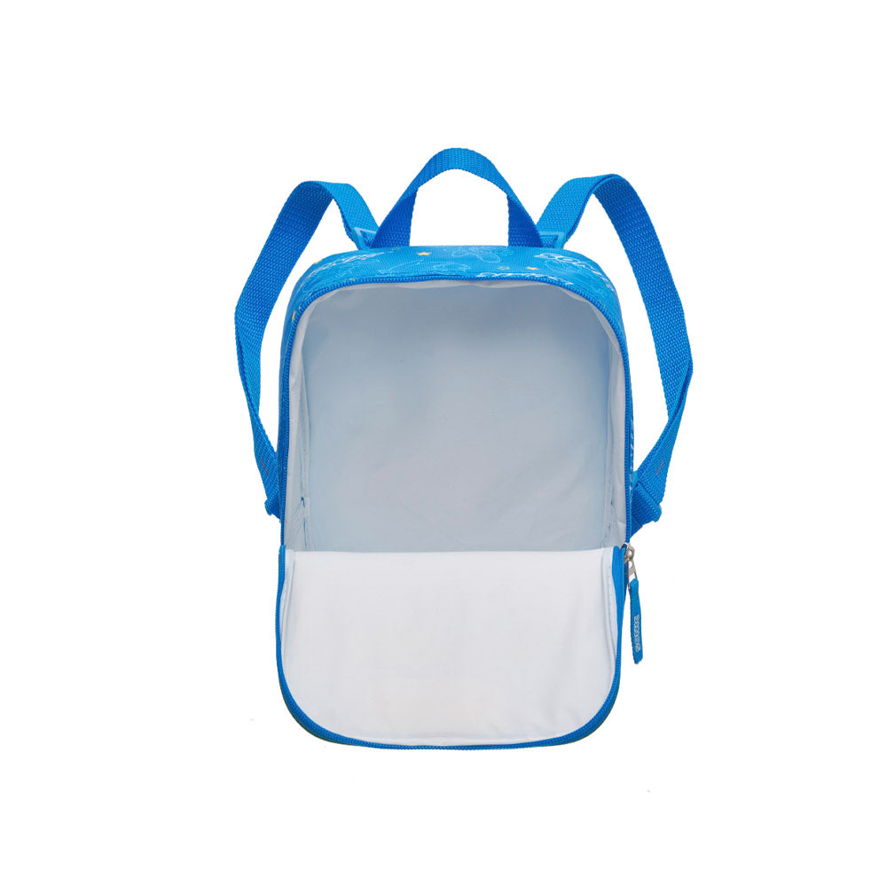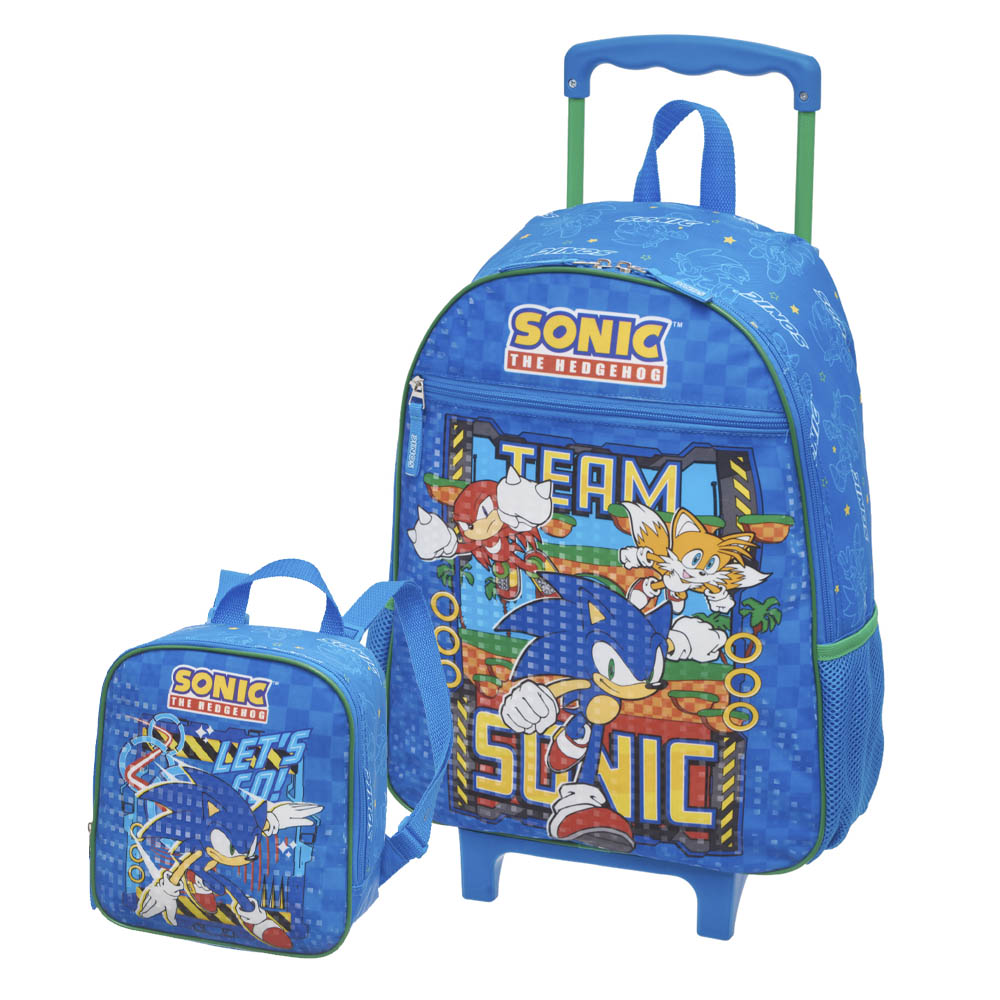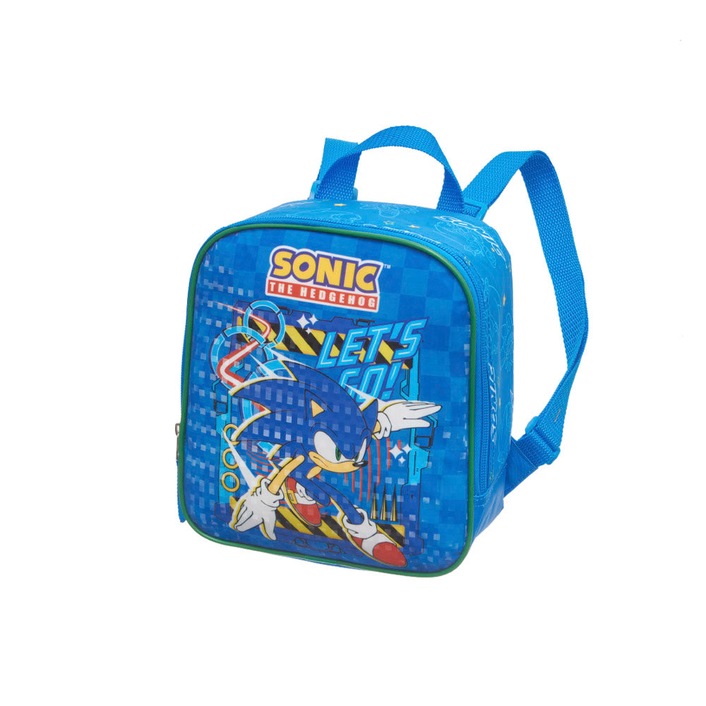 Lancheira Sonic confeccionada em material térmico, com painel frontal em PVC estampado, puxador de zíper personalizado e etiqueta de identificação estampada nas costas, alça de mão e alças de costas reguláveis.