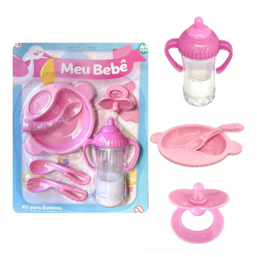 Acompanha mamadeira mágica, pratinho, duas colheres, um garfinho e uma chupeta.