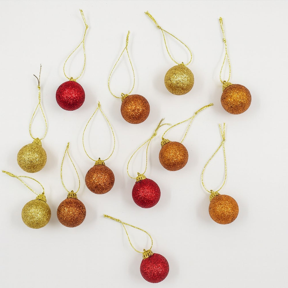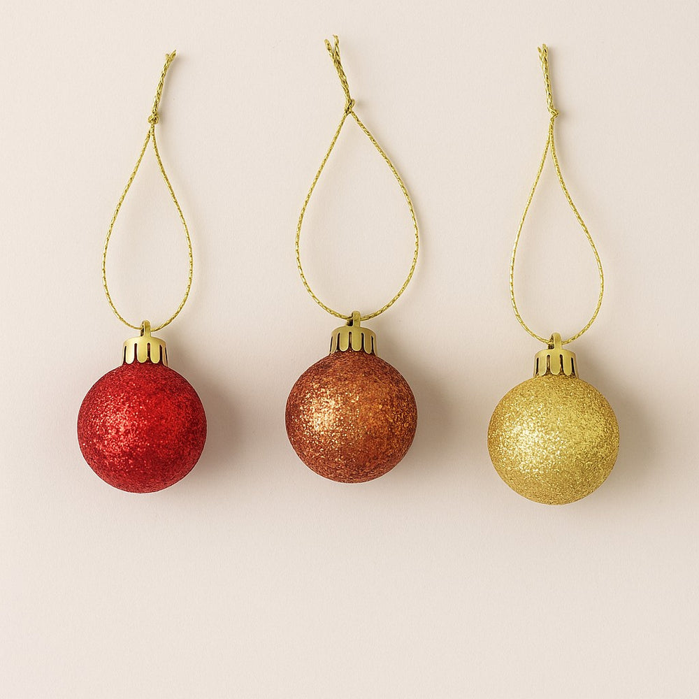 O pacote contém 12 bolas natalinas com glitter em cores vibrantes (vermelho, dourado e cobre), que trazem brilho e sofisticação para sua decoração. Cada bola já vem com cordão dourado para pendurar, facilitando a aplicação em árvores, guirlandas, arranjos ou qualquer ambiente que você queira deixar mais festivo. Perfeito para criar um Natal cheio de brilho, alegria e elegância!
