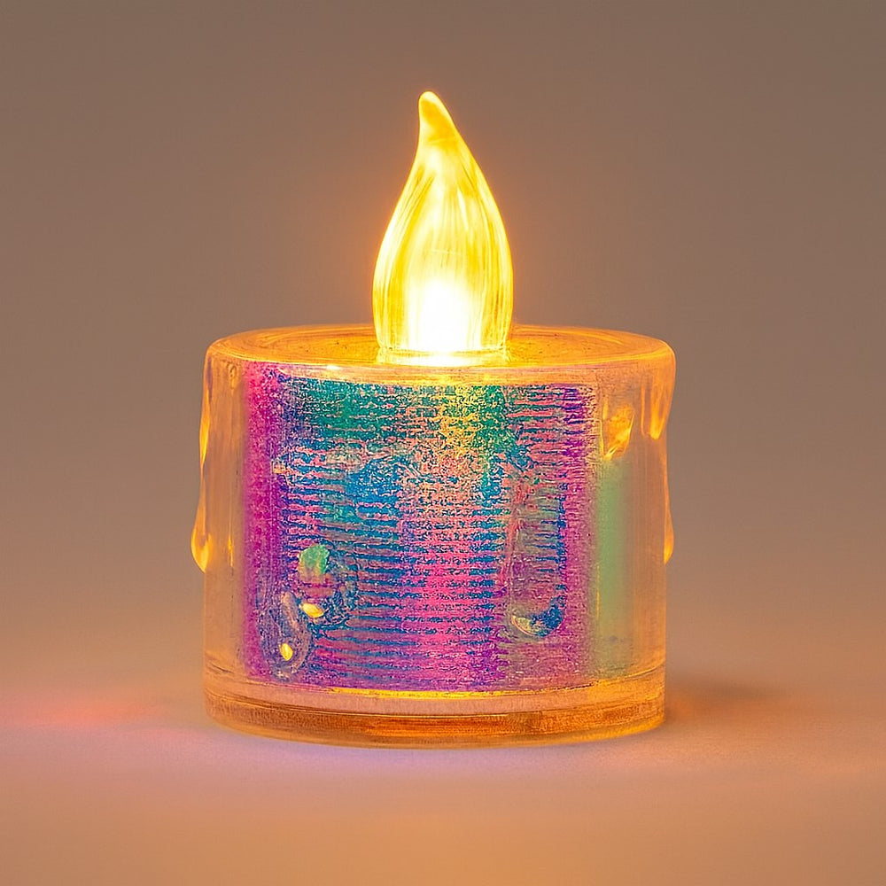 Essa vela decorativa de LED é perfeita para criar um ambiente acolhedor e seguro em qualquer ocasião. Com design que imita uma vela tradicional, incluindo detalhes de cera derretida e chama estilizada, ela emite uma iluminação suave e colorida que alterna entre tons vibrantes, proporcionando um efeito encantador.