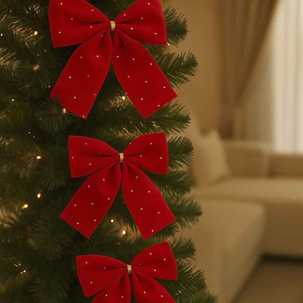 Celebre a magia do Natal com este lindo conjunto de laços natalinos vermelhos, perfeitos para levar cor, brilho e aquele toque tradicional que não pode faltar na sua decoração de fim de ano. Com um vermelho vibrante e pequenos pontos de brilho que remetem a estrelas cintilando na noite de Natal, esses laços são ideais para deixar sua árvore de Natal, guirlandas, arranjos de mesa ou até embalagens de presente ainda mais especiais. O detalhe dourado no centro traz sofisticação e reforça o clima festivo que só o Natal tem. Produzidos em tecido com textura aveludada, cada laço mede aproximadamente 11 cm x 10,5 cm, com um tamanho perfeito para criar composições delicadas e cheias de charme.
