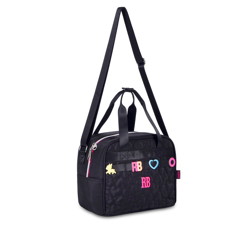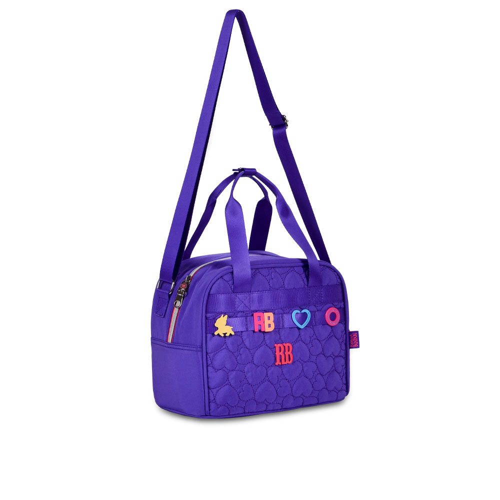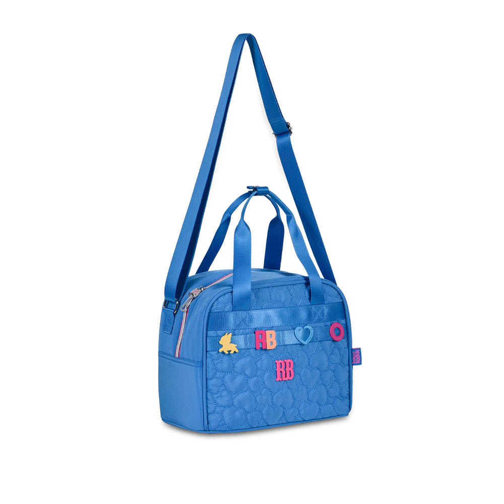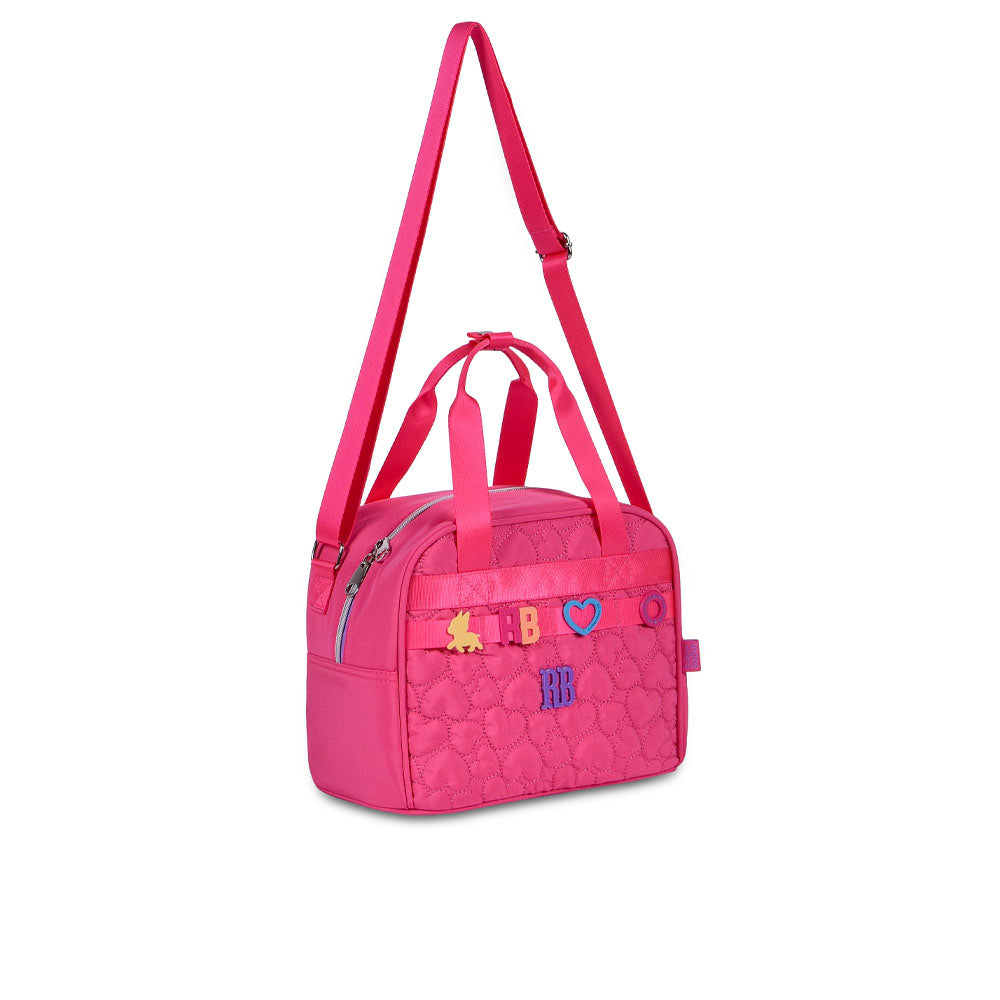 Lancheira confeccionada em material térmico e com matelassê, alça de mão, alça traseira para por na haster da mochila roda e alça tiracolo transversal regulável fixa à peça, possui um bolso principal e um bolso menor na parte traseira e detalhe fofo de corações na parte frontal.