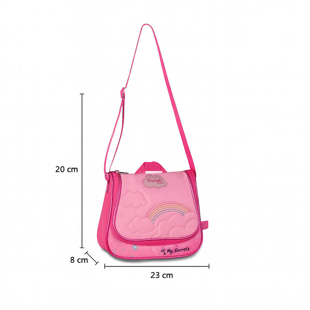 Disponível em três cores alegres (rosa, azul e lilás), cada versão traz estampa delicada de arco-íris com nuvens em alto-relevo, além de pequenos detalhes coloridos que deixam o acessório ainda mais divertido e especial.