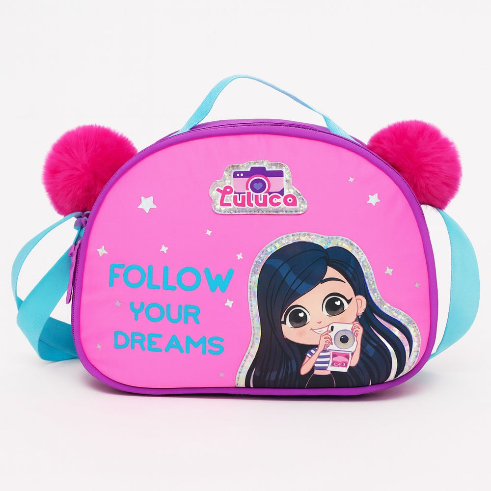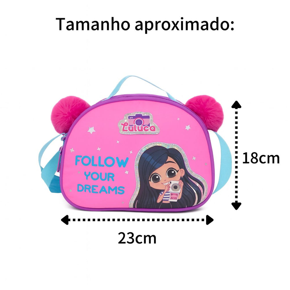 Com design moderno e encantador, ela apresenta a estampa da influenciadora mirim Luluca segurando uma câmera, cercada por detalhes holográficos e a frase inspiradora “Follow Your Dreams” (“Siga seus sonhos”).