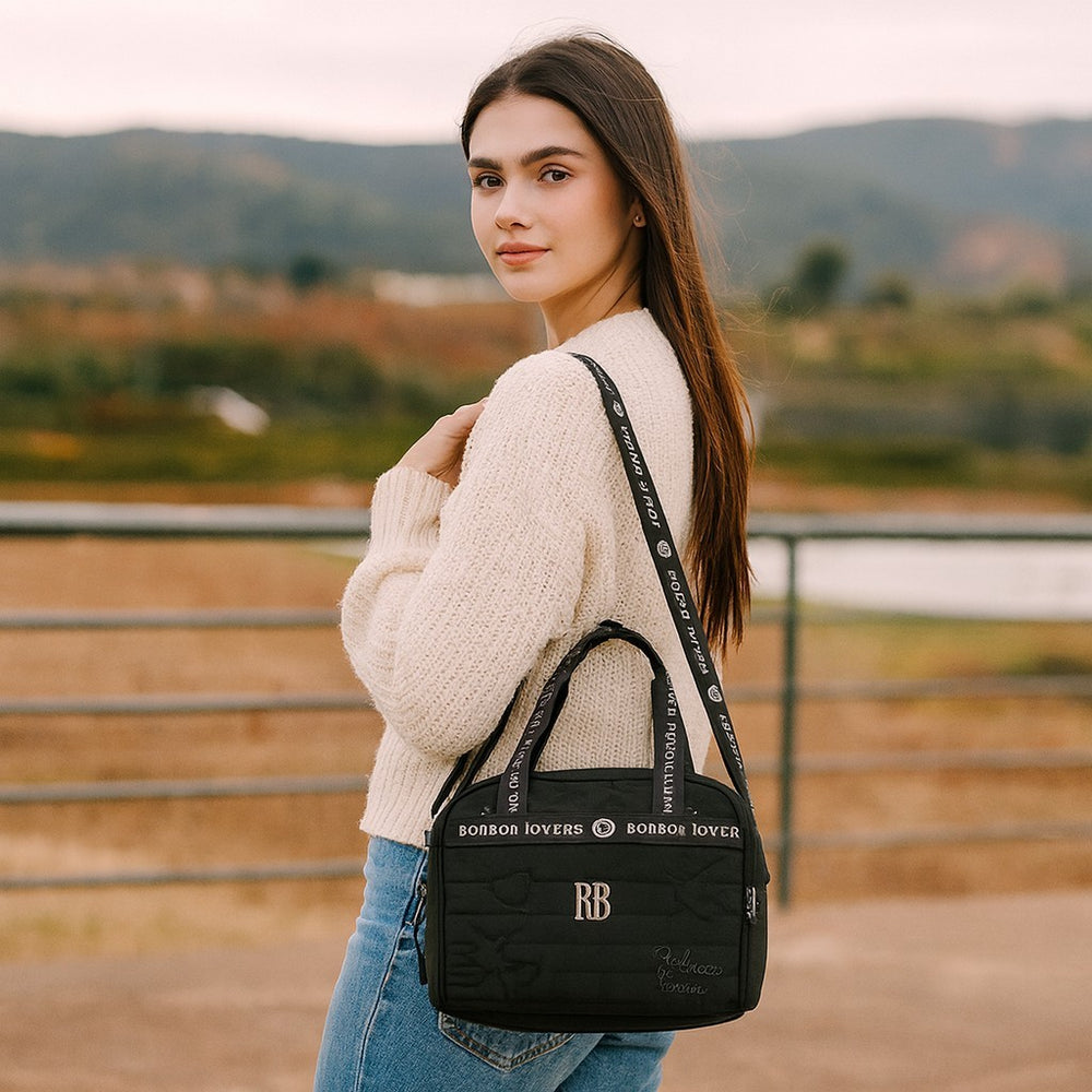 Conta com alça de mão e alça longa ajustável, que permite usar tanto no ombro quanto na transversal. O fechamento em zíper personalizado com puxador garante mais charme e segurança, enquanto o espaço interno é ideal para transportar lanches e refeições com conforto e organização.