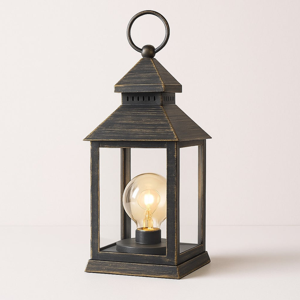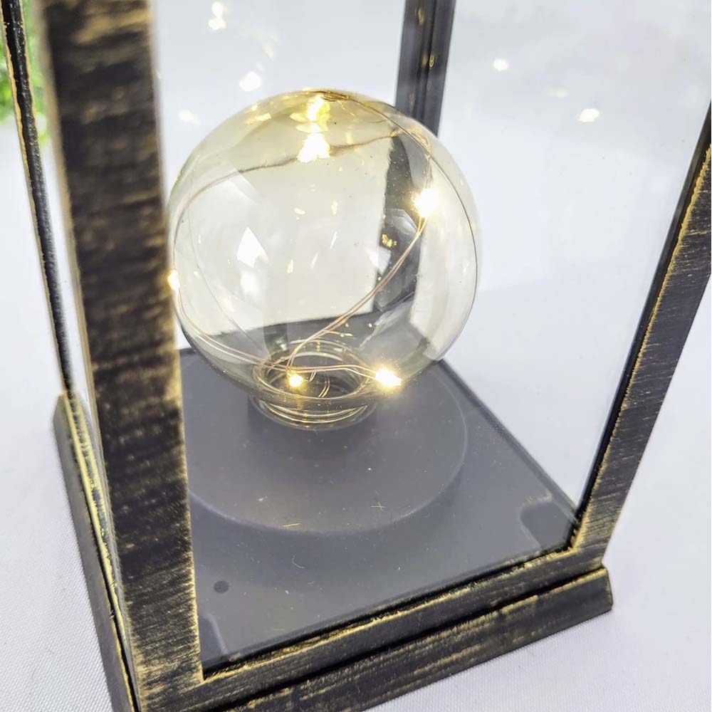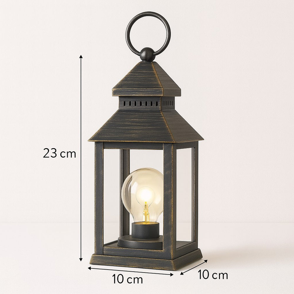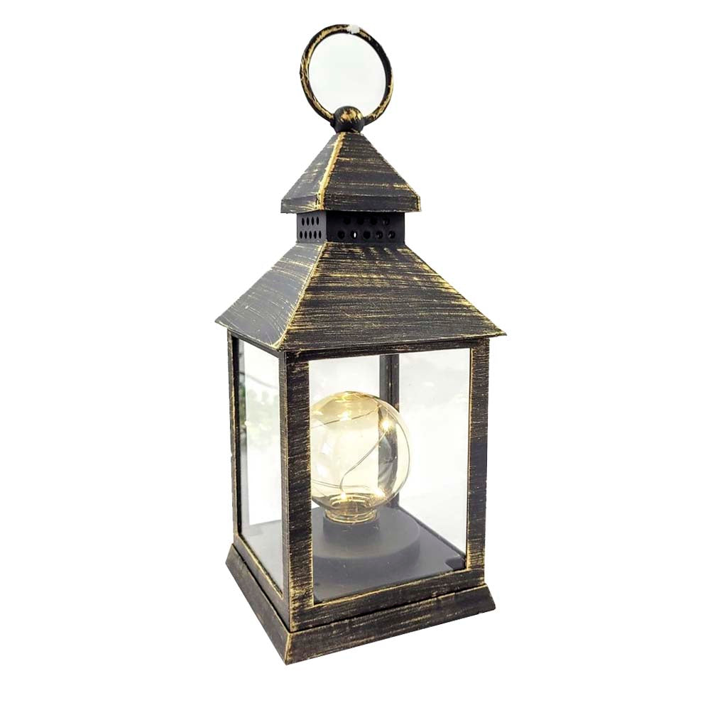A lamparina possui uma lâmpada com fio de led dentro na cor branco quente e alça na parte de cima para carregar ou pendurar em sua decoração. A cor pode variar entre dourado e bronze com aspecto rústico e antigo.