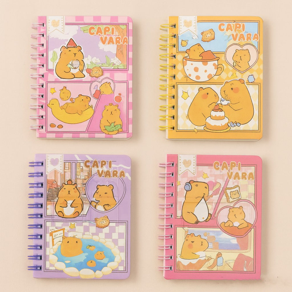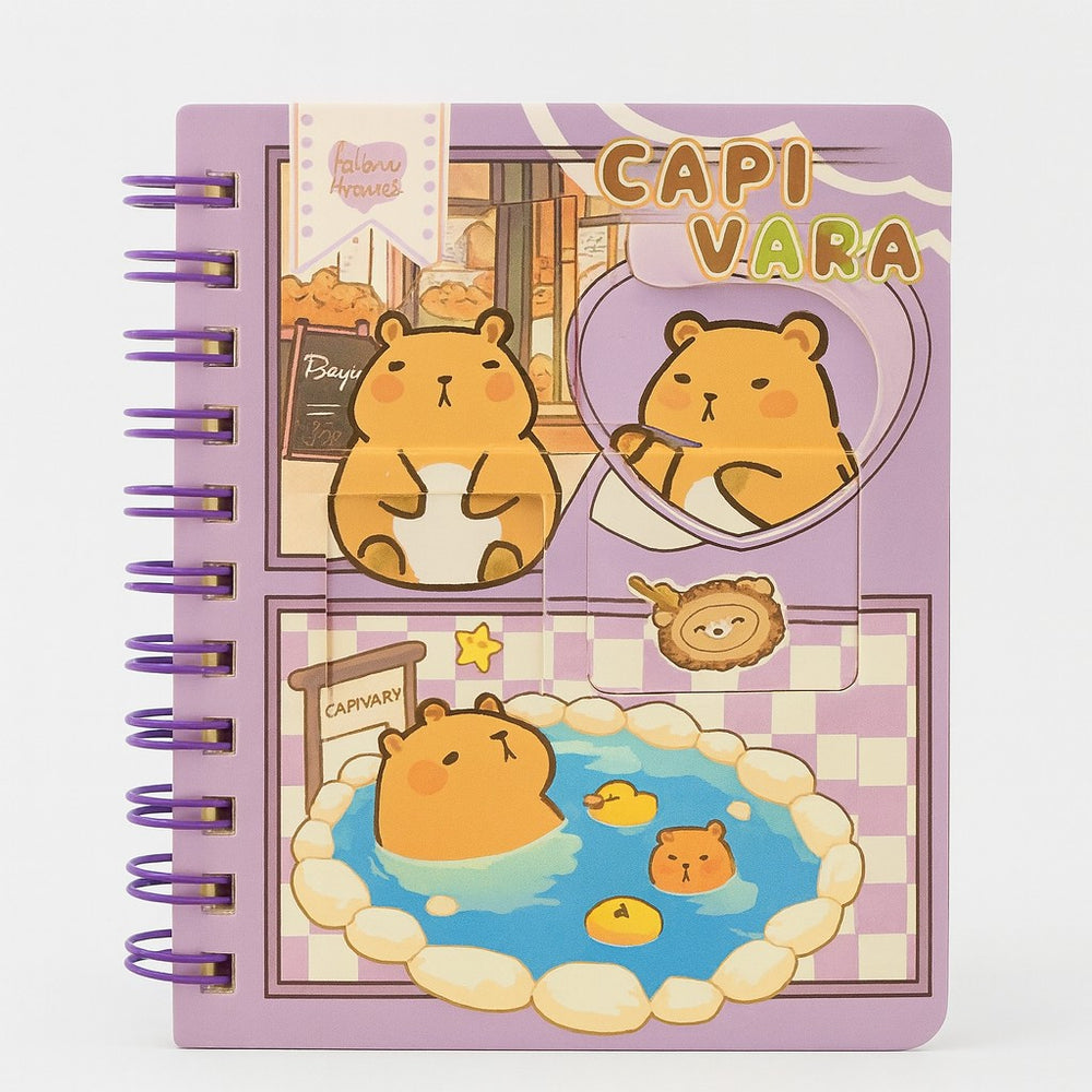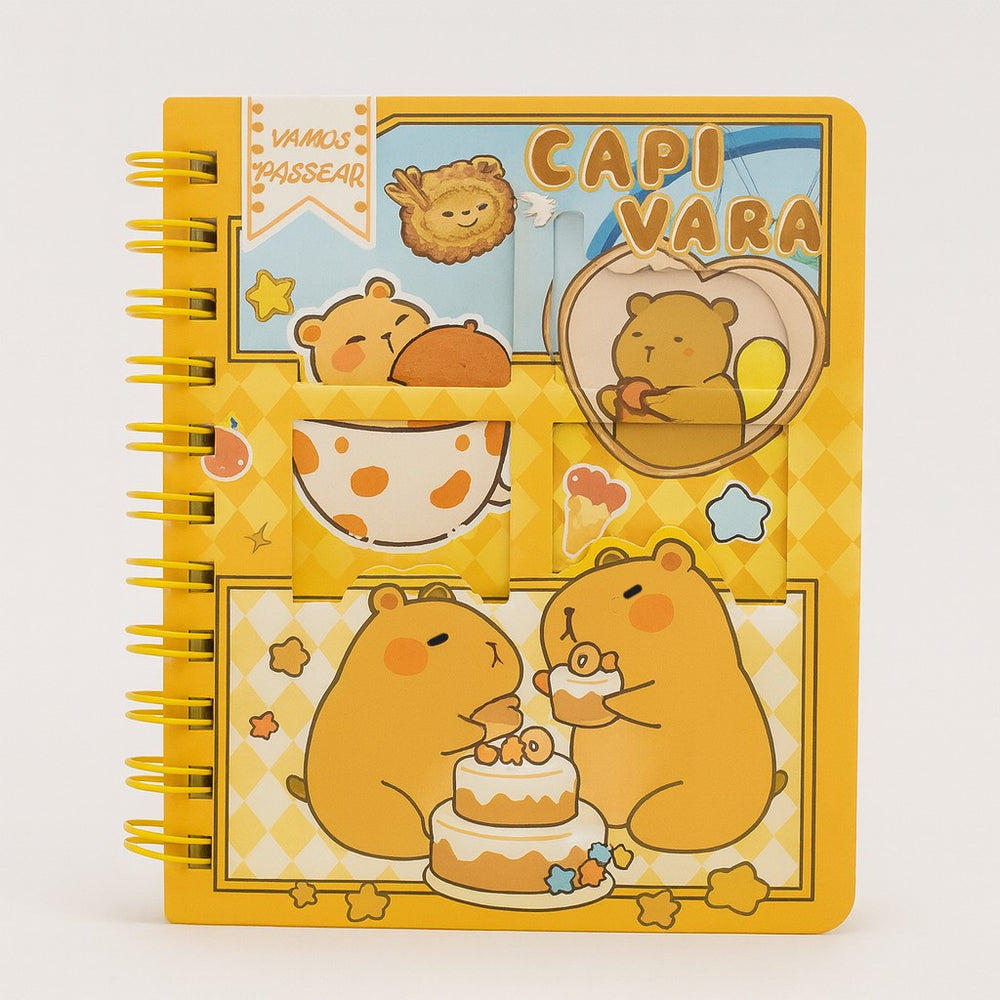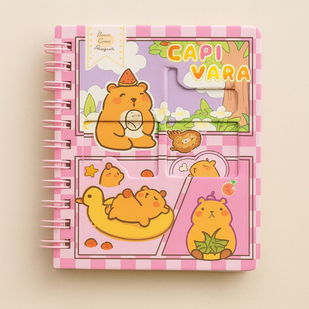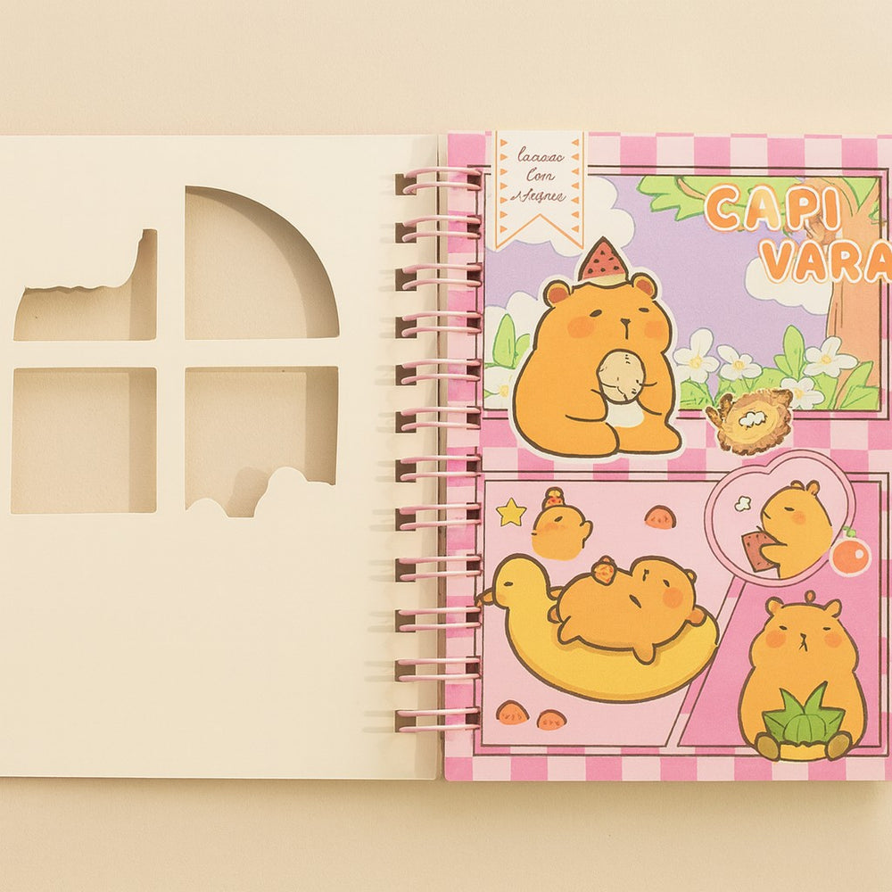 Suas páginas contam com linhas bem distribuídas e ilustrações delicadas de capivaras, que tornam cada anotação mais charmosa e divertida.
