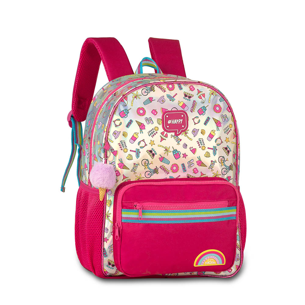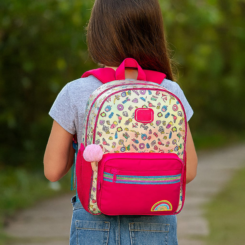 Mochila de Costa Emoji confeccionada em material holográfico, conta com bolso principal com amplo espaço, 2 bolsos na parte frontal em fechamento em ziper, bolsos laterais telado com elástico para por garrafinha e entre outros pequenos objetos, possui alças para por nas costas acolchoadas e reguláveis, zíper personalizado, e ainda mais, tem um lindo chaveiro de pompom sorvete colorido.