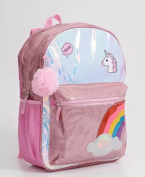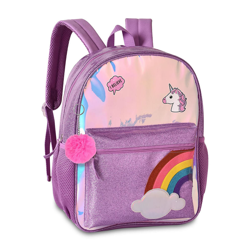 O modelo é todo estiloso e confeccionado em poliéster. Além de ser muito bonita, conta com detalhes em glitter, patches bordados e efeito holográfico que reflete cores diferentes em contato com a luz, dando mais vida para a mochila escolar. Acompanha ainda um chaveiro pompom que é uma gracinha.